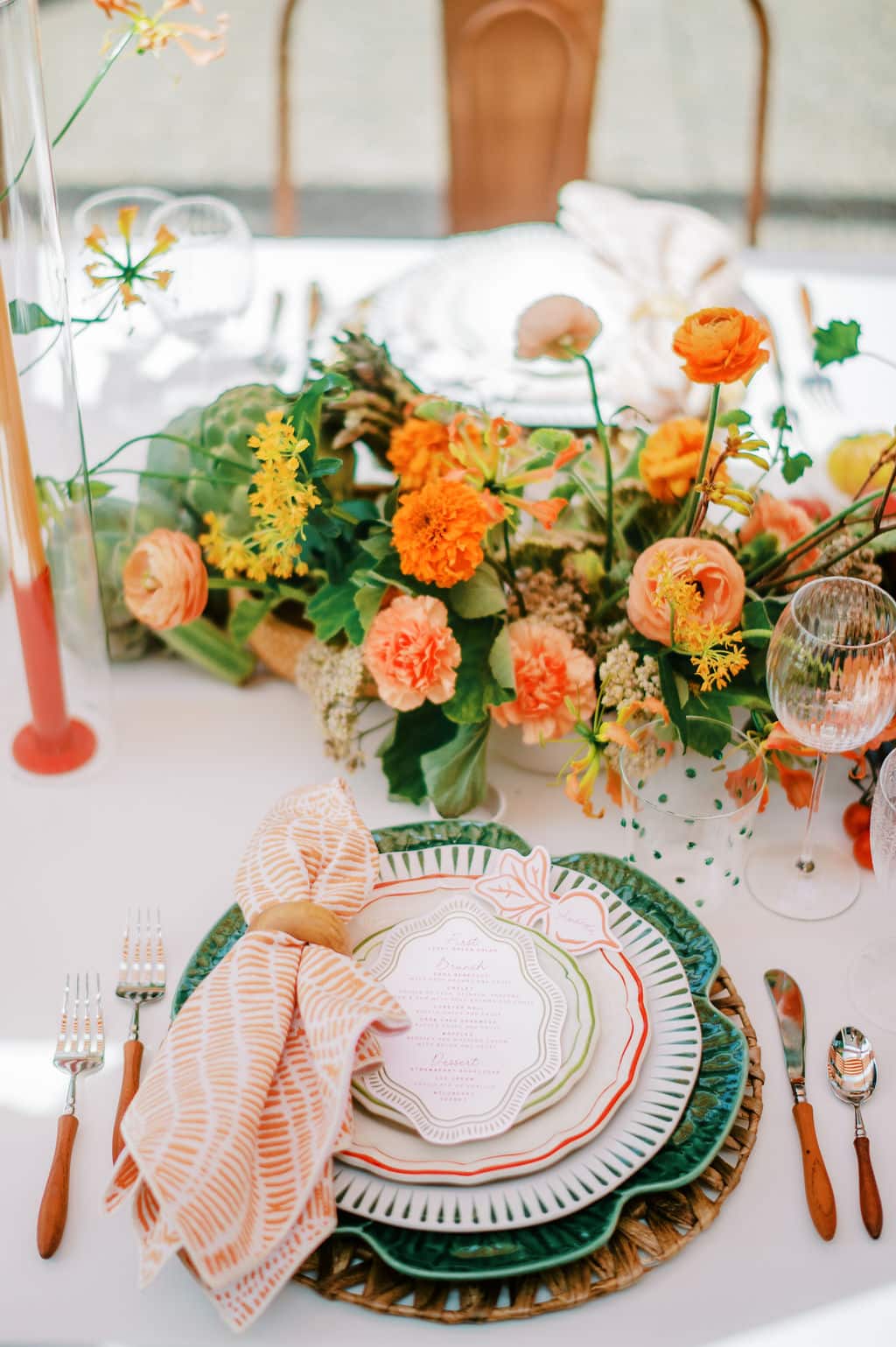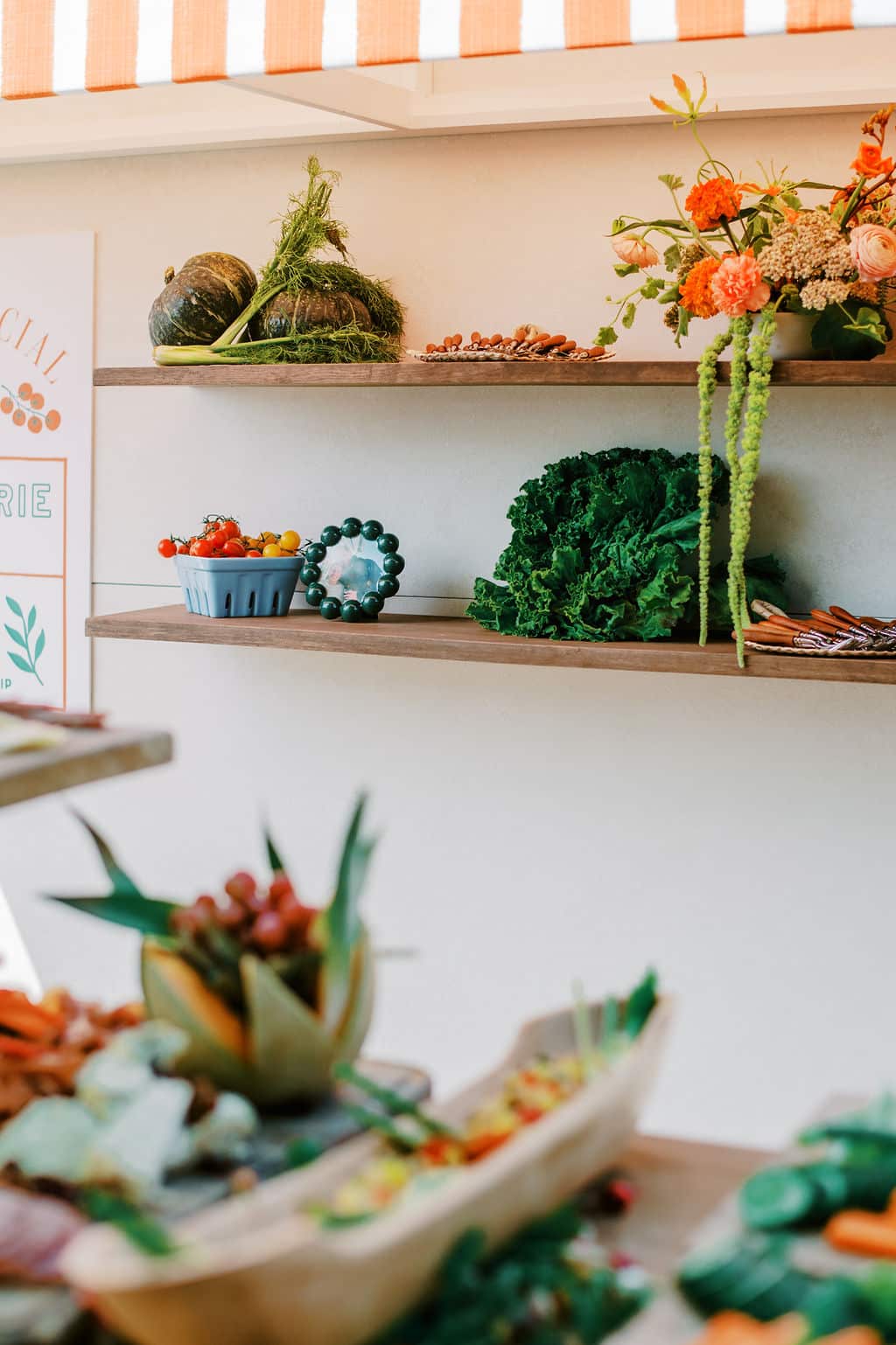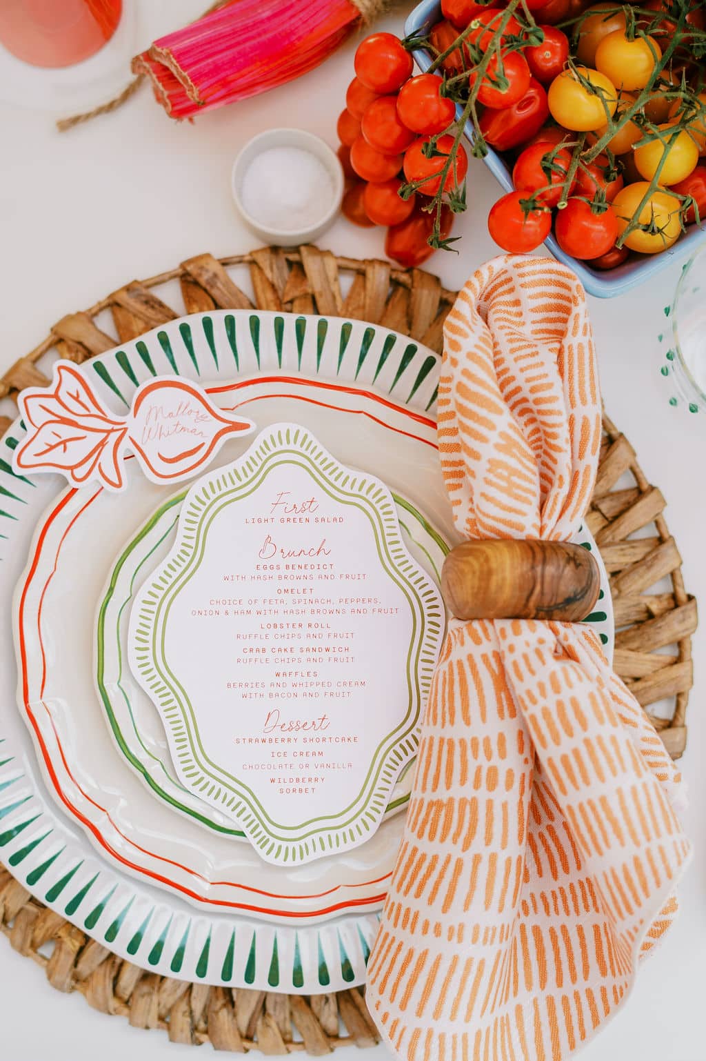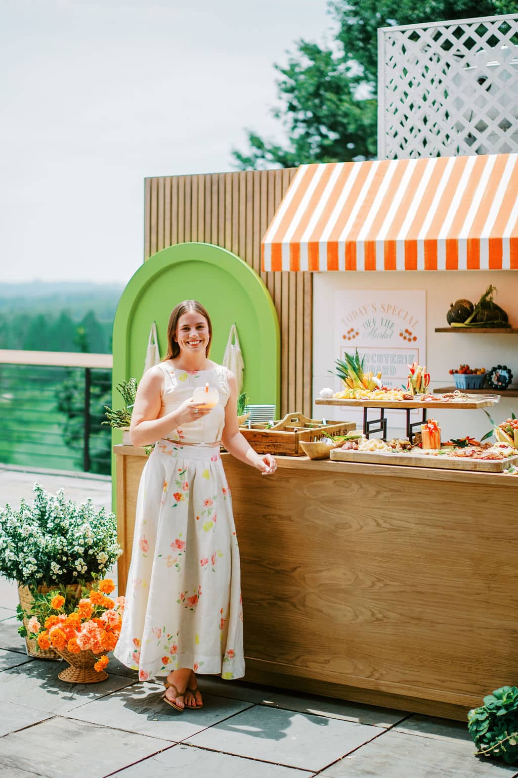 An Italian-inspired farmers market bridal shower came to life at Eagle’s Nest Country Club in Maryland. Set on a beautiful overlook with orange-and-white draping, the design felt vibrant, bright, and full of personality. The tables featured our green cabbage chargers, basil stripe dinner plates, red Sylvie salads, and green Sylvie B&Bs - a colorful palette that tied the entire celebration together in true market-to-table style.
