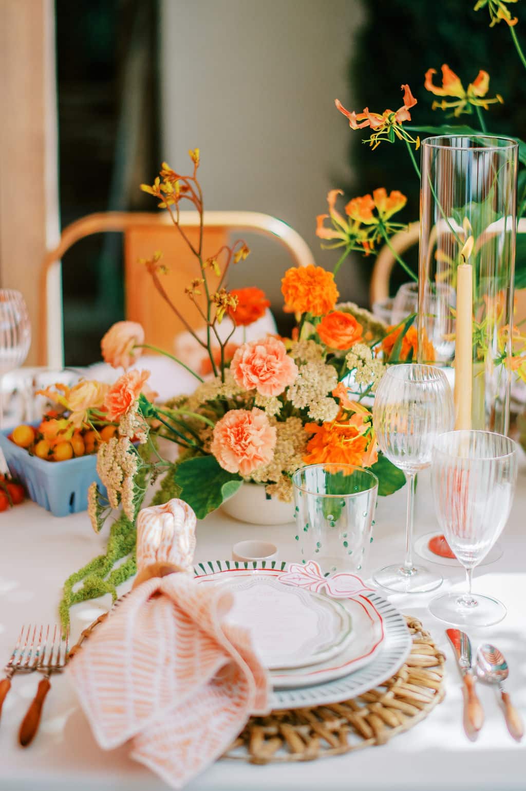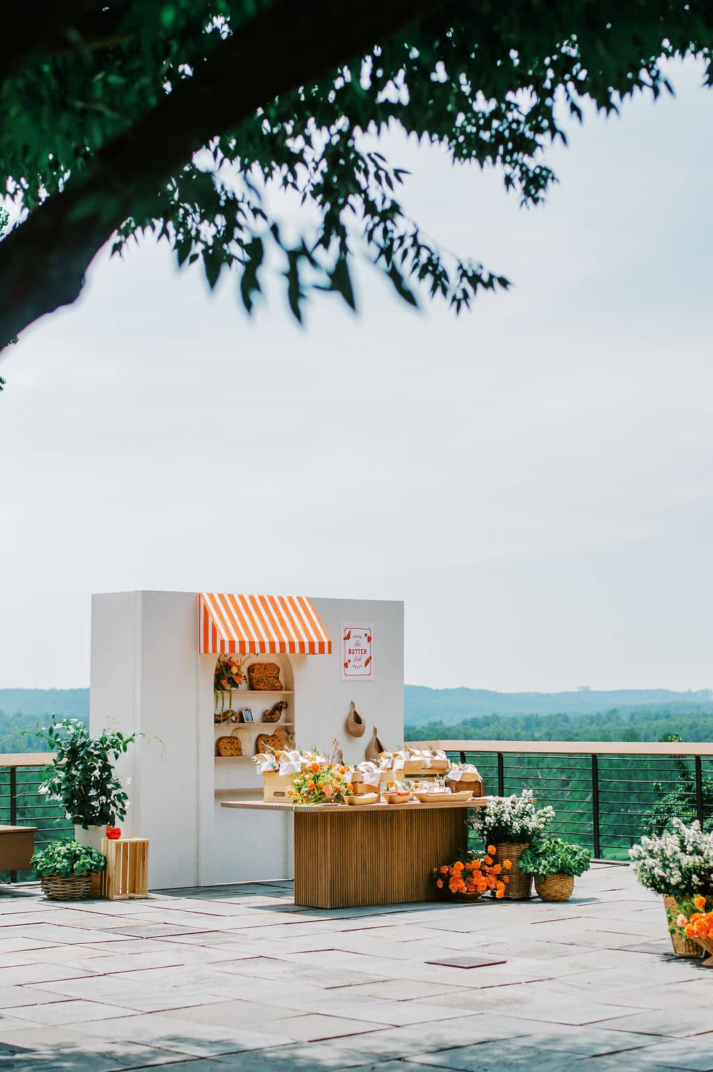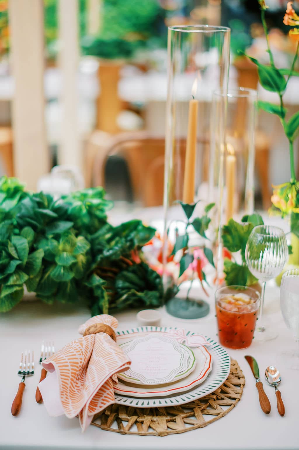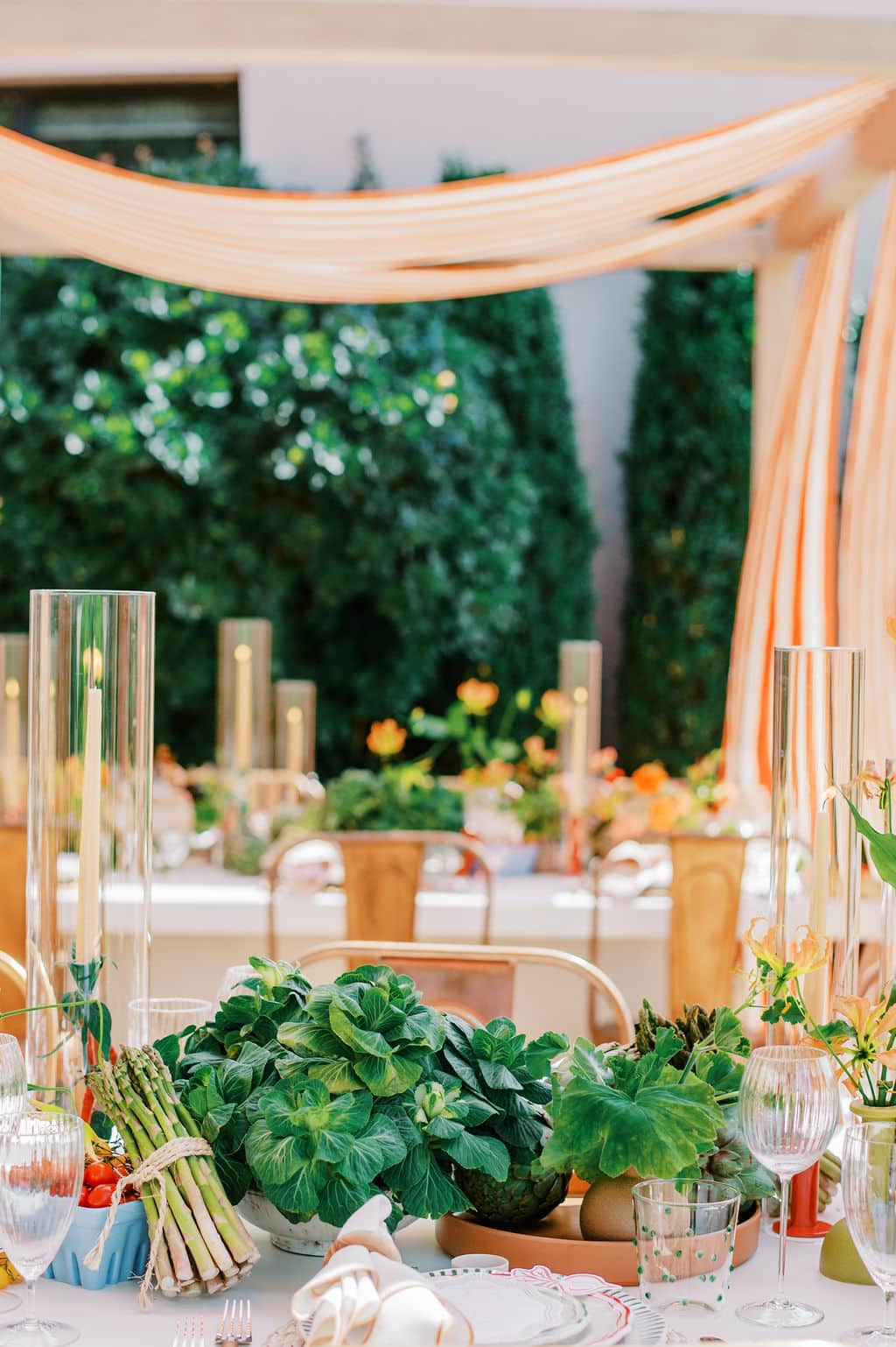 An Italian-inspired farmers market bridal shower came to life at Eagle’s Nest Country Club in Maryland. Set on a beautiful overlook with orange-and-white draping, the design felt vibrant, bright, and full of personality. The tables featured our green cabbage chargers, basil stripe dinner plates, red Sylvie salads, and green Sylvie B&Bs - a colorful palette that tied the entire celebration together in true market-to-table style.