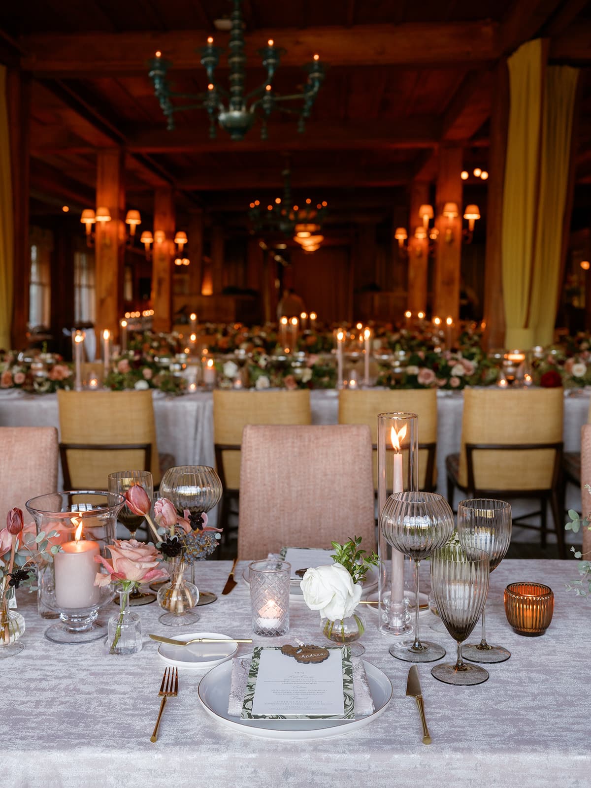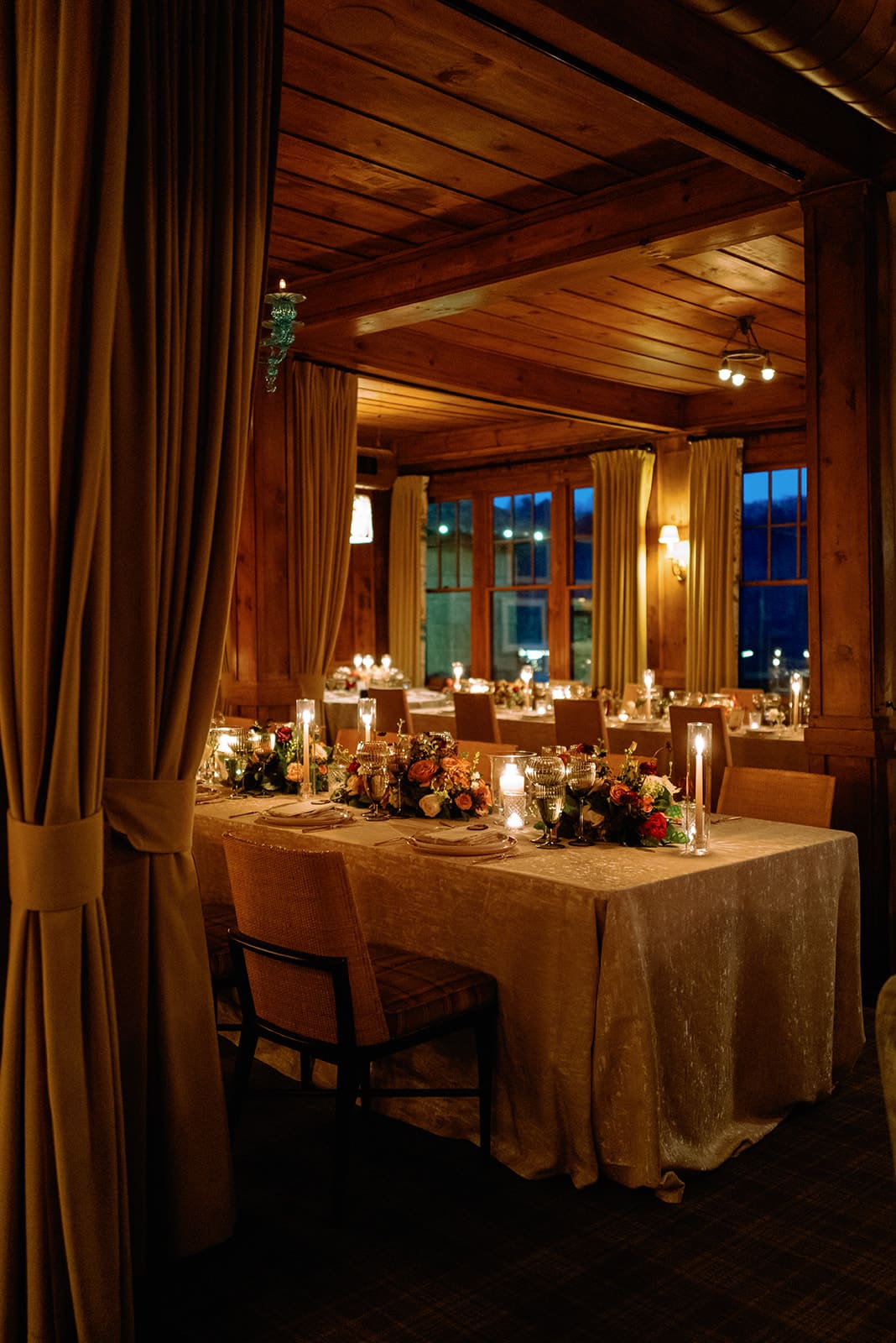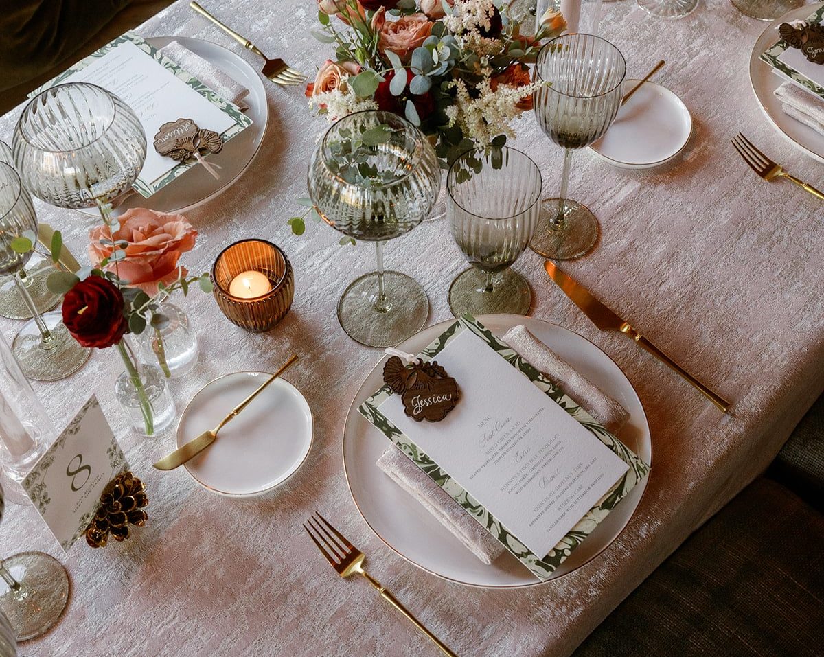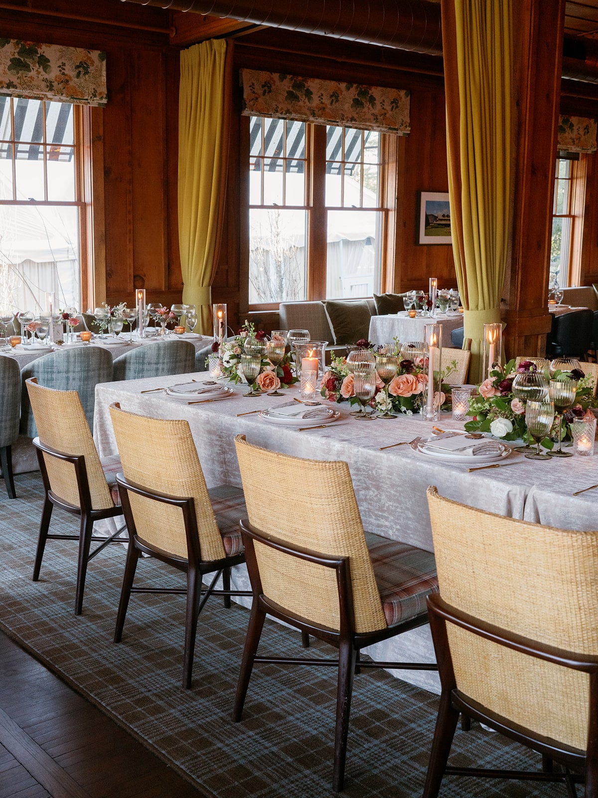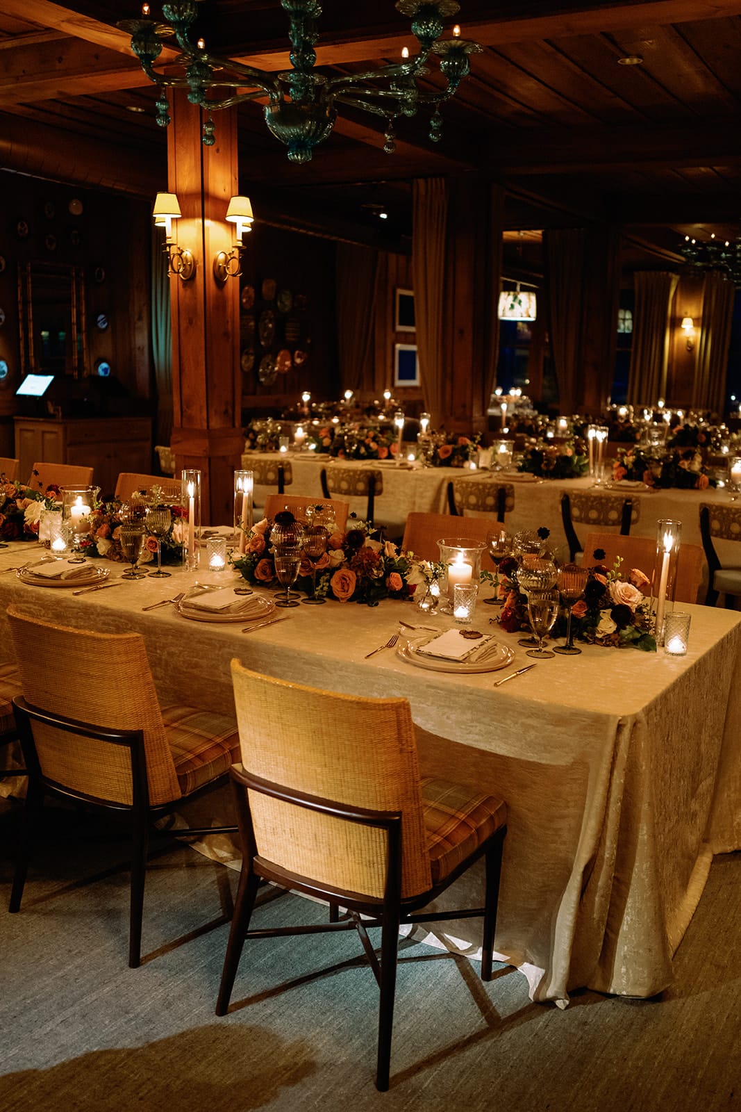 An autumn wedding at High Hampton in Cashiers, NC featured an intimate reception layered with candlelight, lush florals, and warm seasonal tones. With classic white-and-gold Audrey plates, gold flatware, and British green glassware, the tablescape struck the perfect balance of elegance and romance.