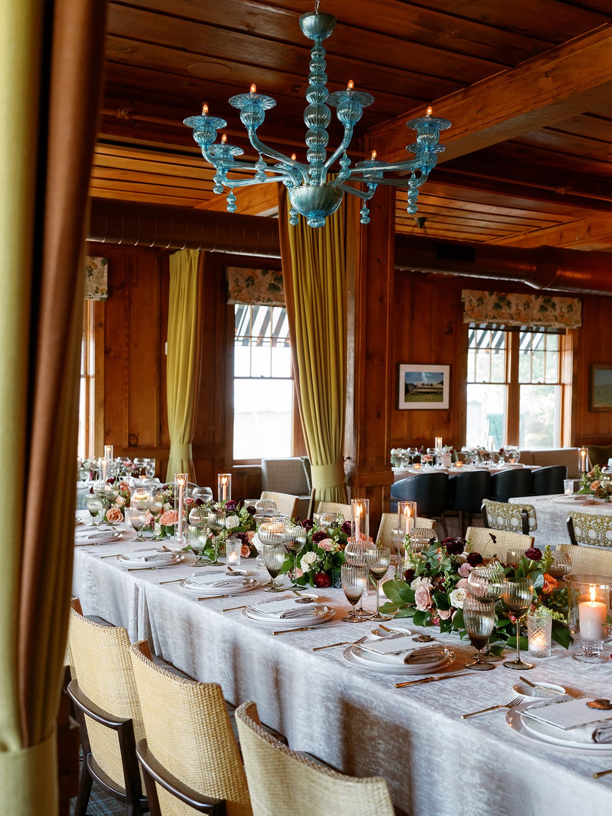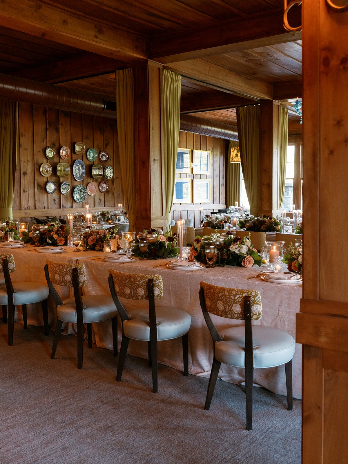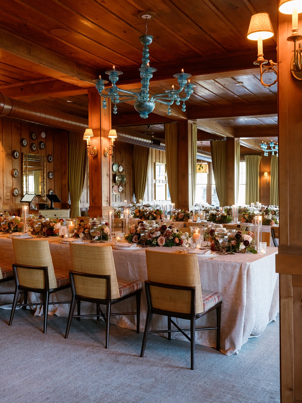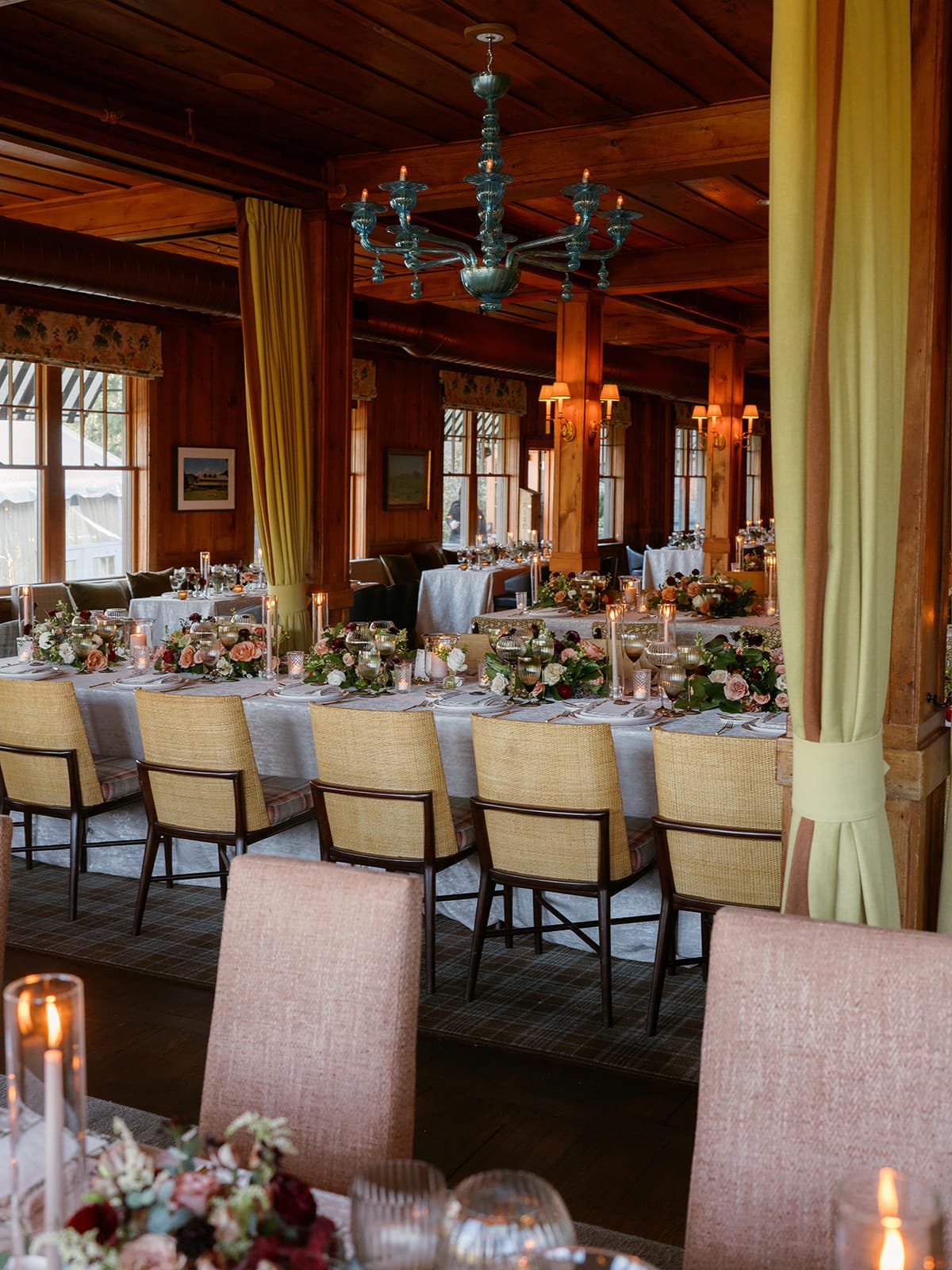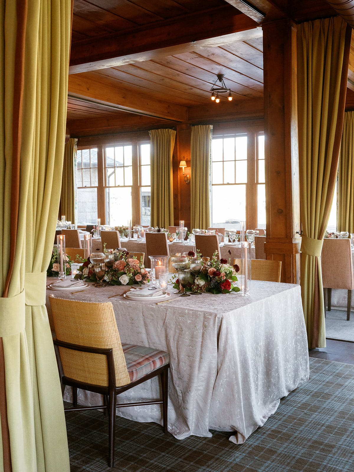 An autumn wedding at High Hampton in Cashiers, NC featured an intimate reception layered with candlelight, lush florals, and warm seasonal tones. With classic white-and-gold Audrey plates, gold flatware, and British green glassware, the tablescape struck the perfect balance of elegance and romance.