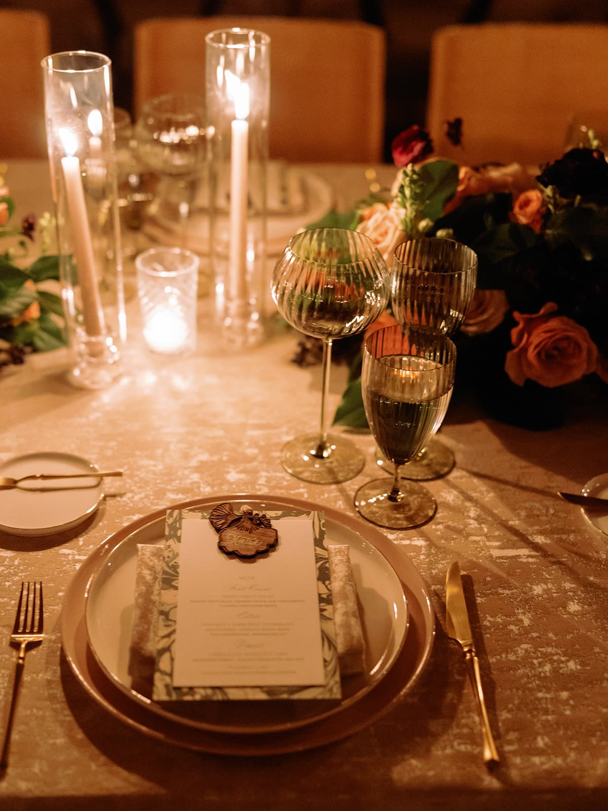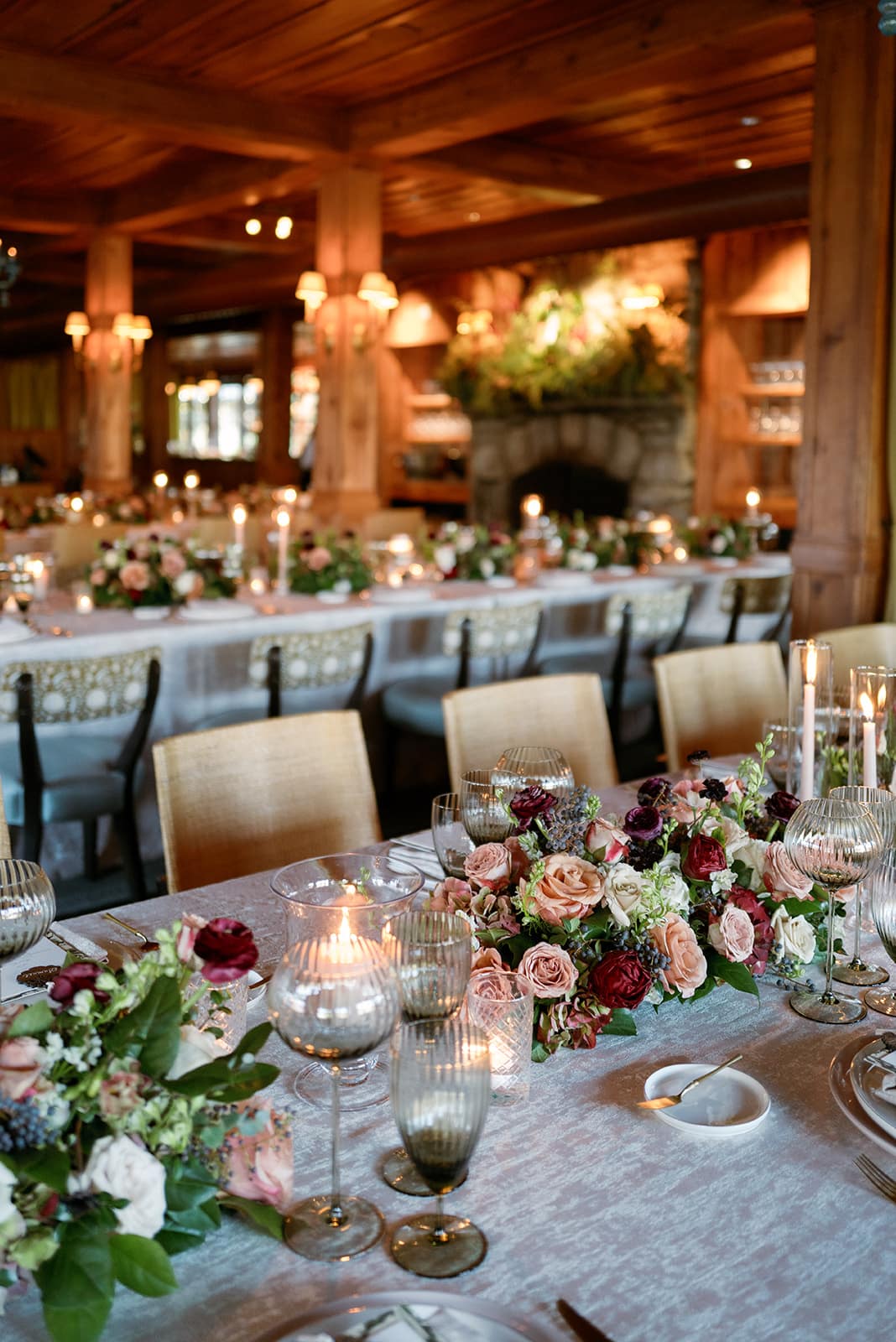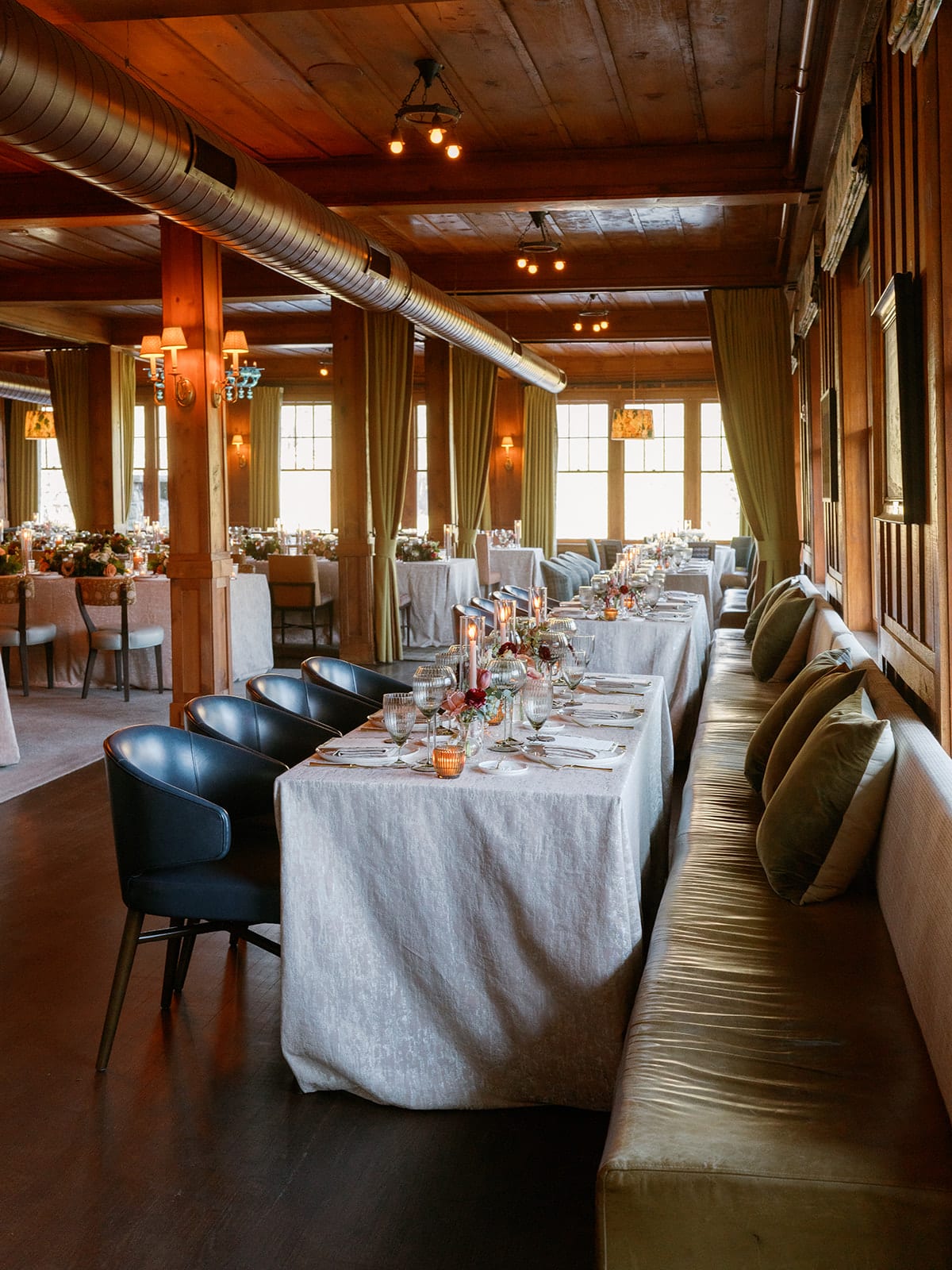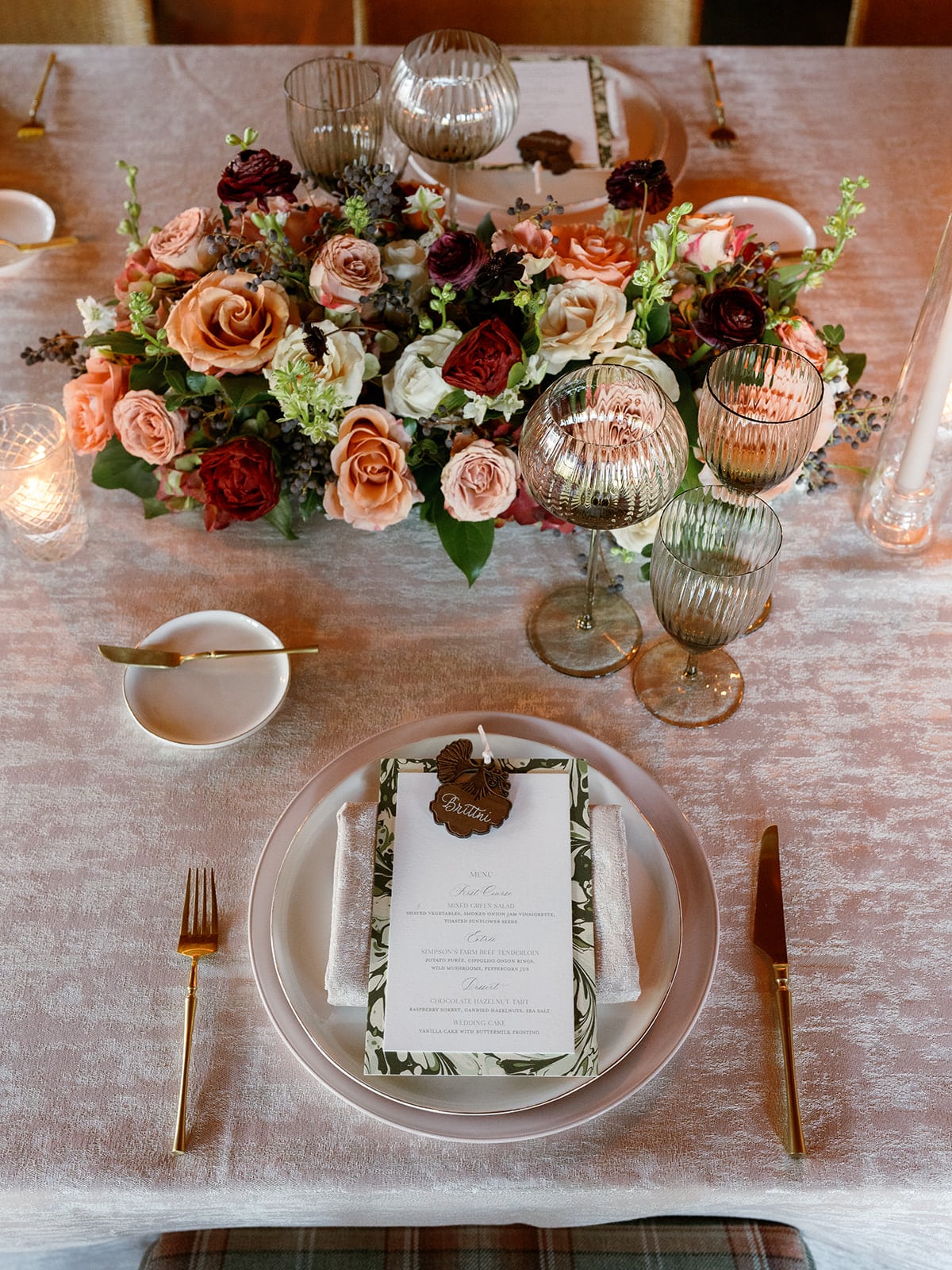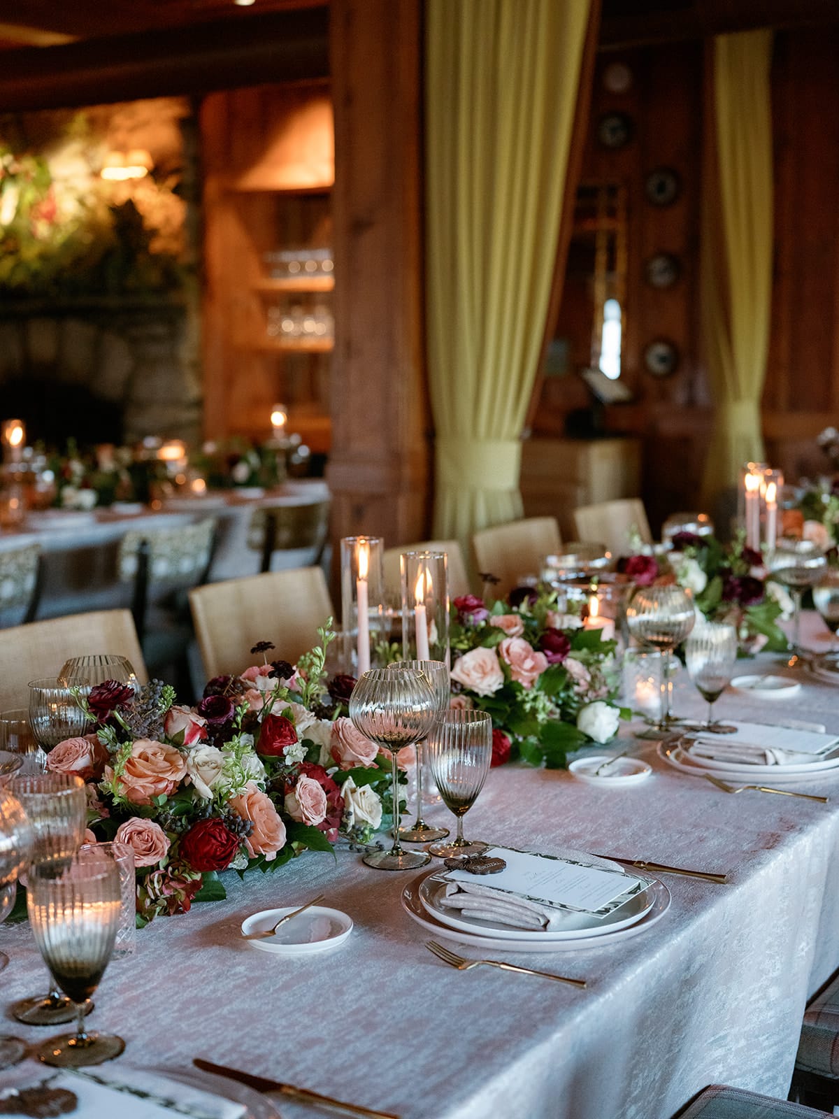 An autumn wedding at High Hampton in Cashiers, NC featured an intimate reception layered with candlelight, lush florals, and warm seasonal tones. With classic white-and-gold Audrey plates, gold flatware, and British green glassware, the tablescape struck the perfect balance of elegance and romance.