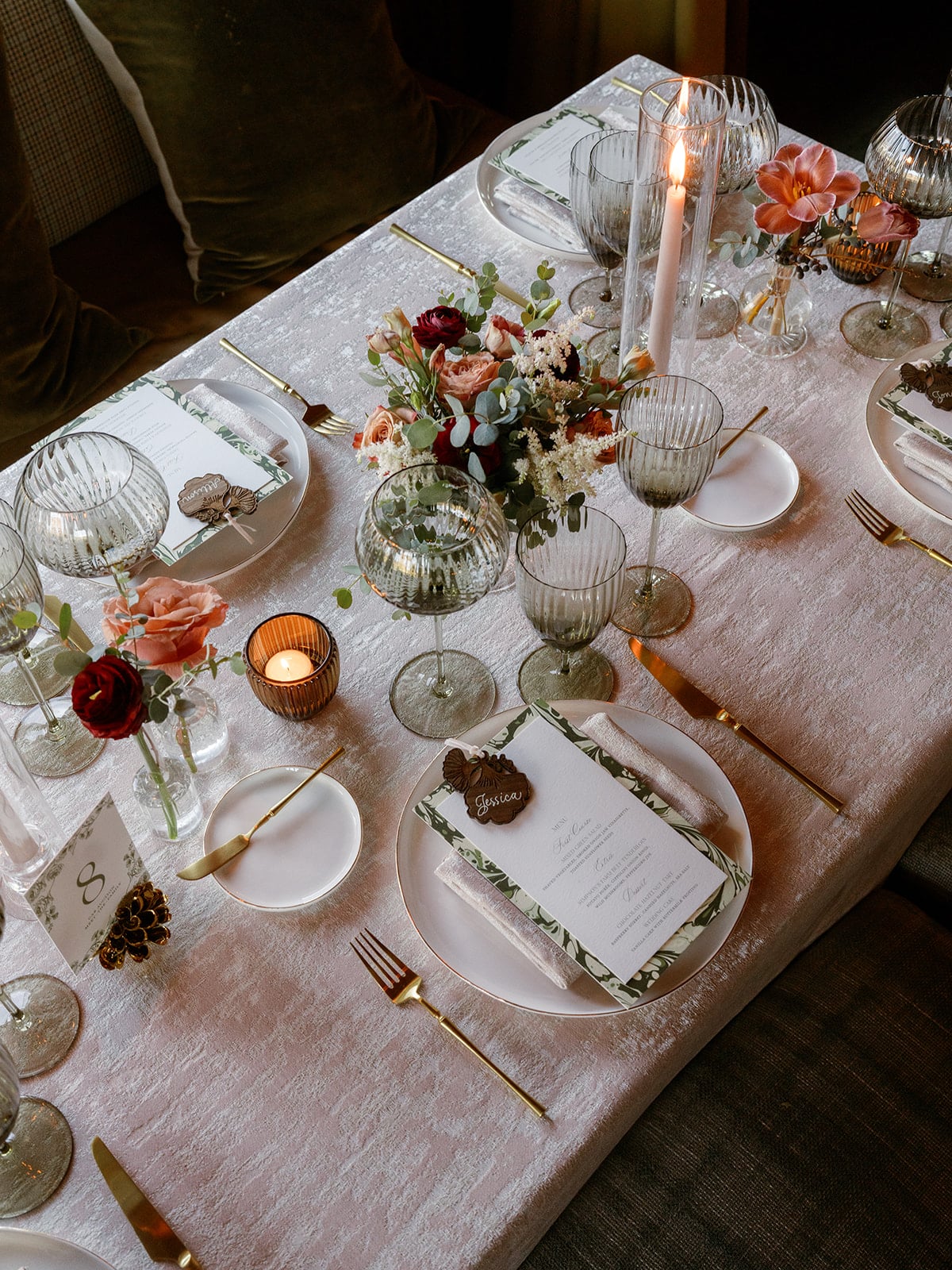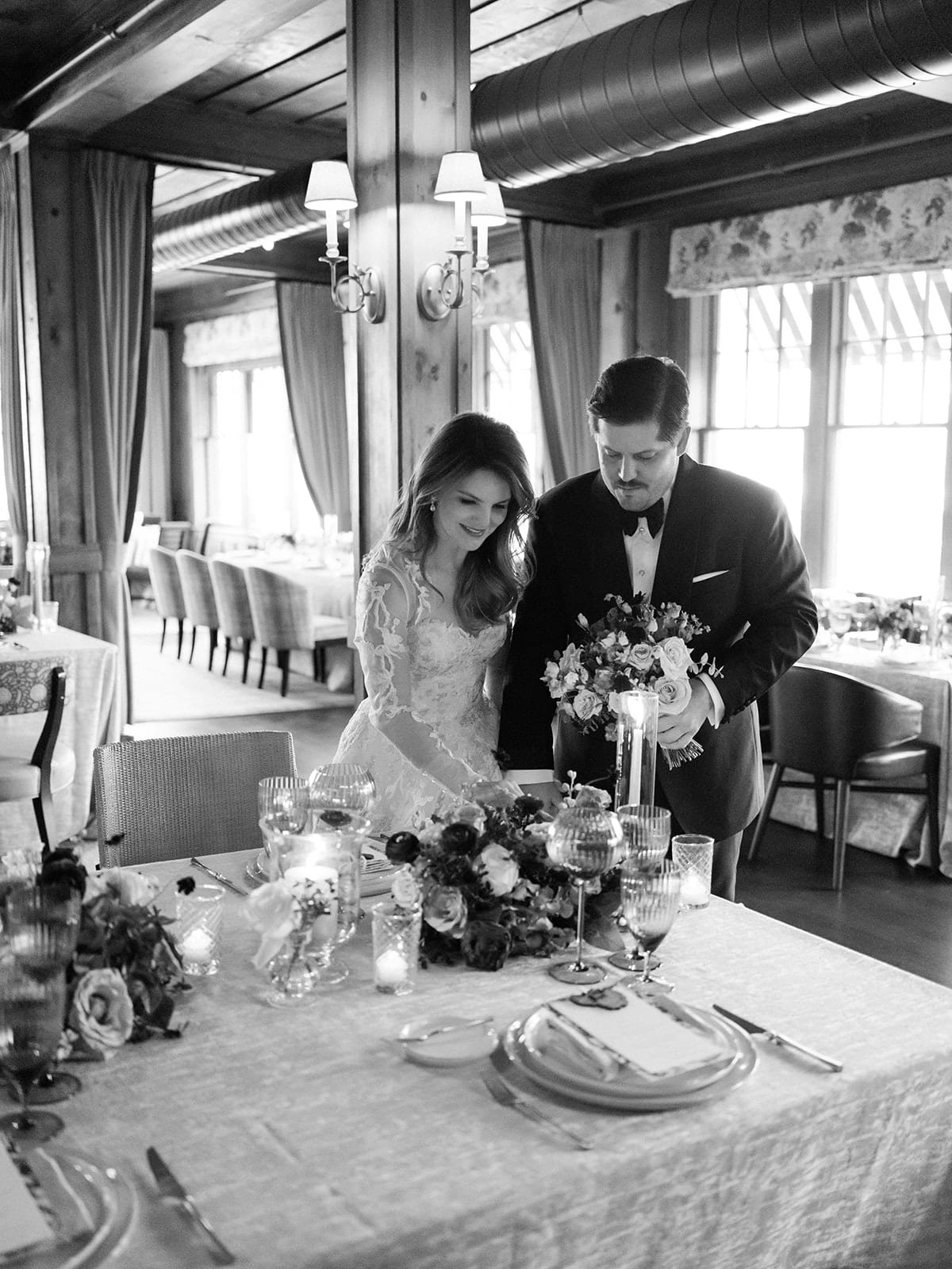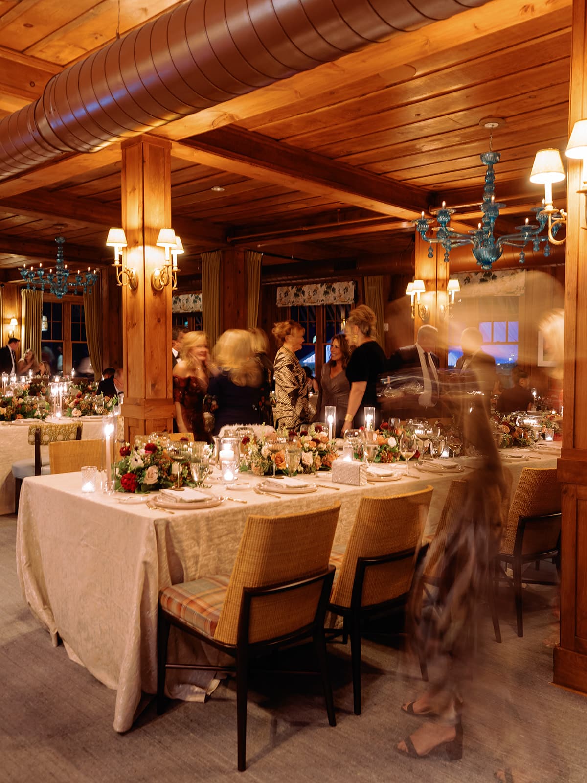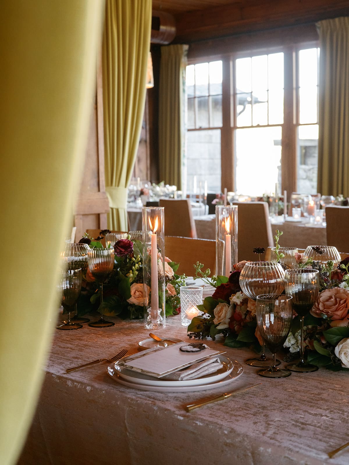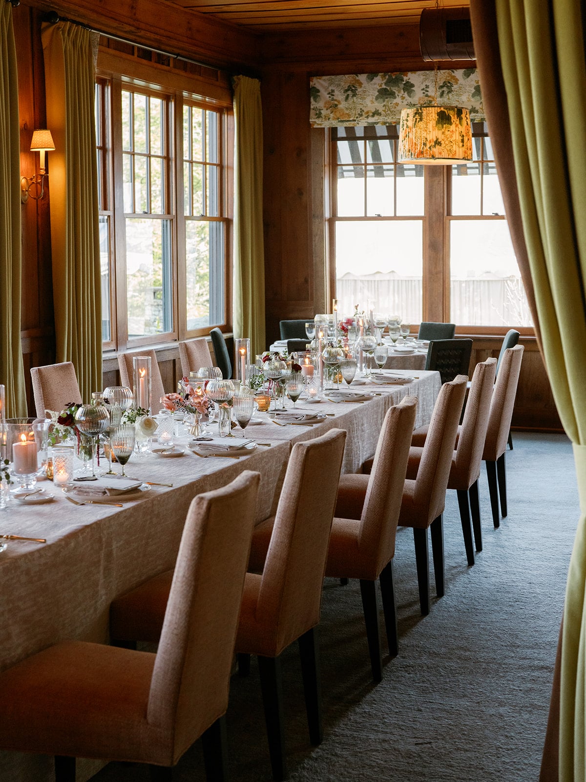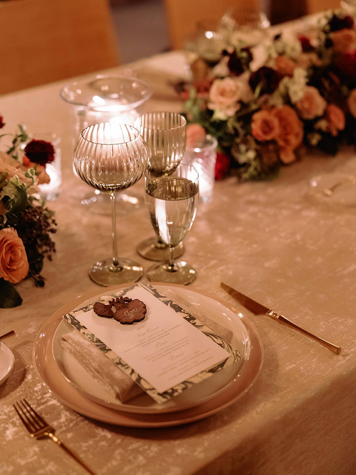 An autumn wedding at High Hampton in Cashiers, NC featured an intimate reception layered with candlelight, lush florals, and warm seasonal tones. With classic white-and-gold Audrey plates, gold flatware, and British green glassware, the tablescape struck the perfect balance of elegance and romance.
