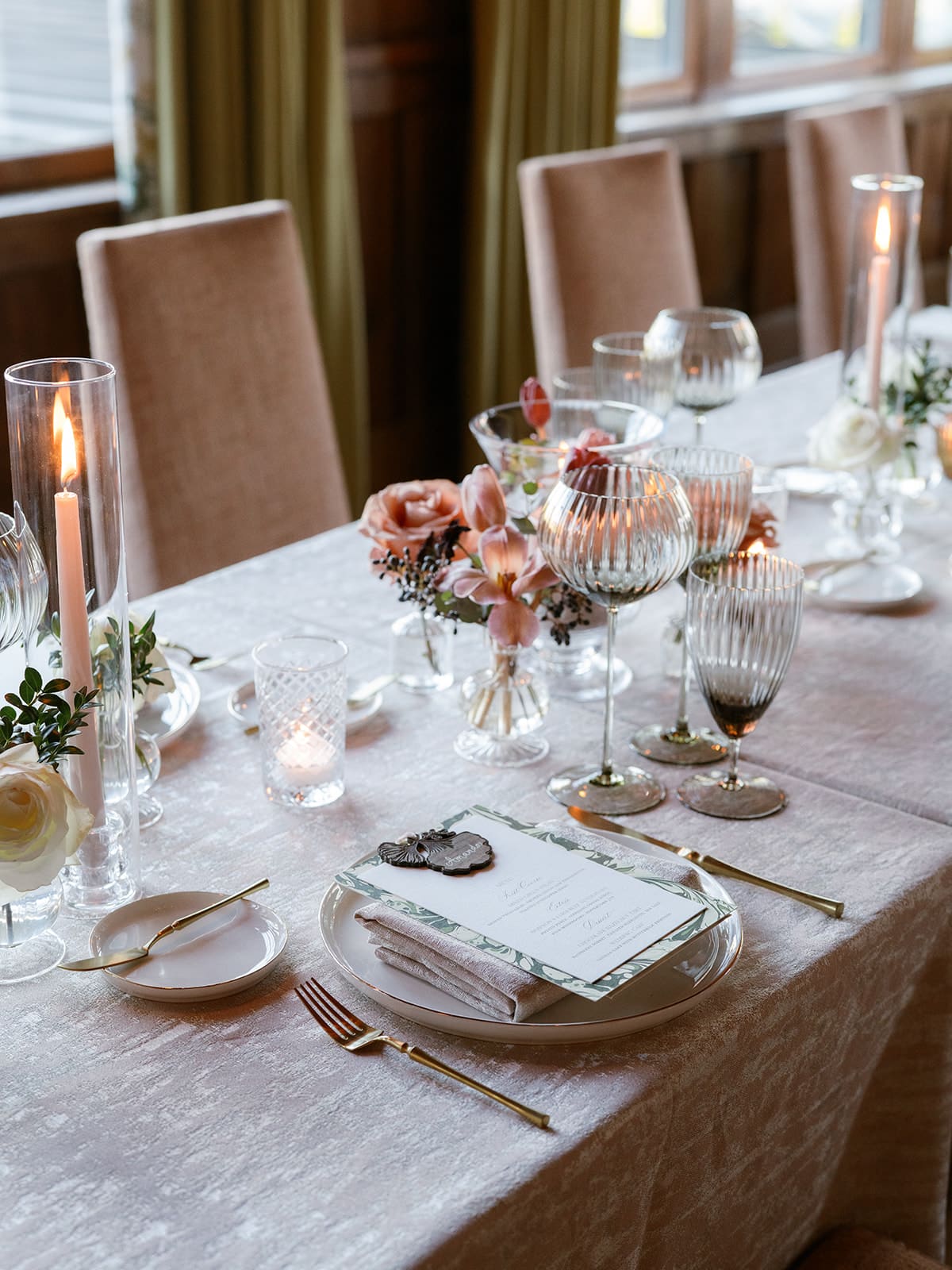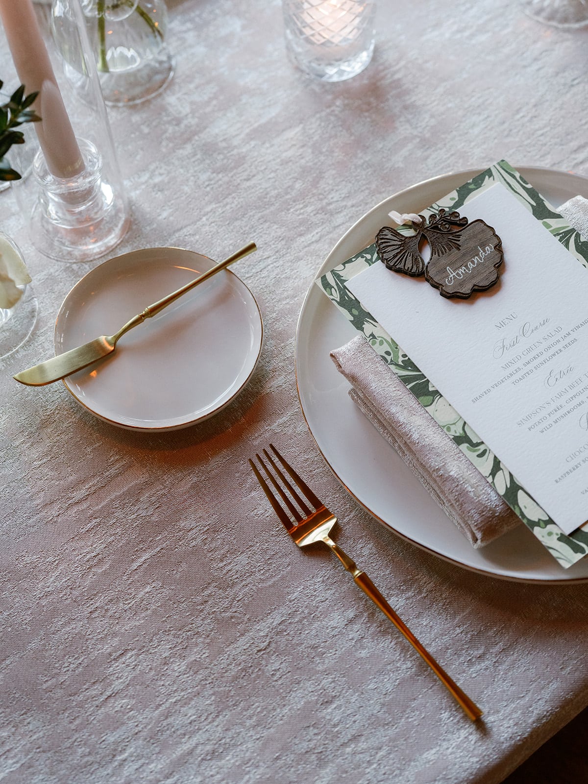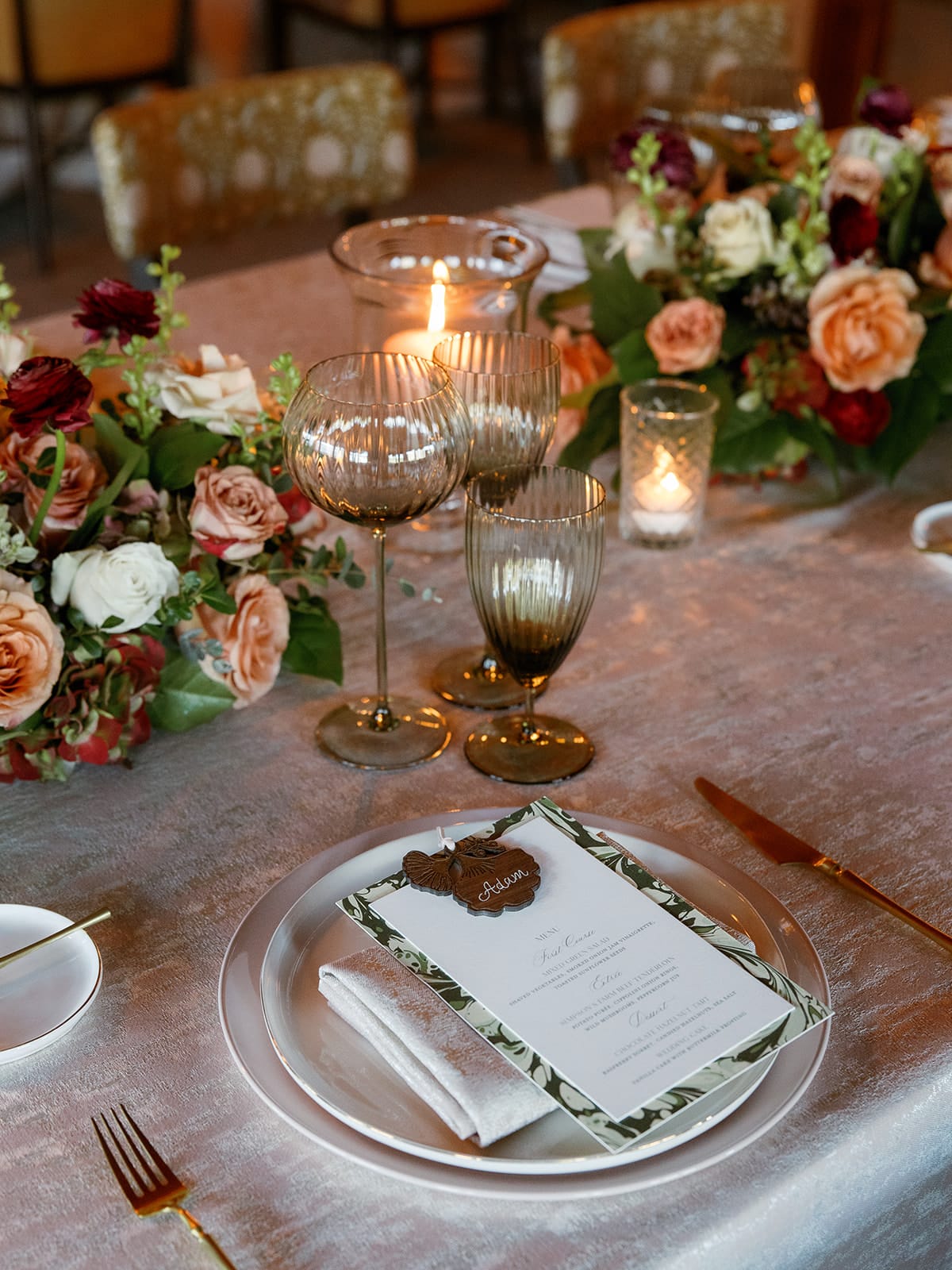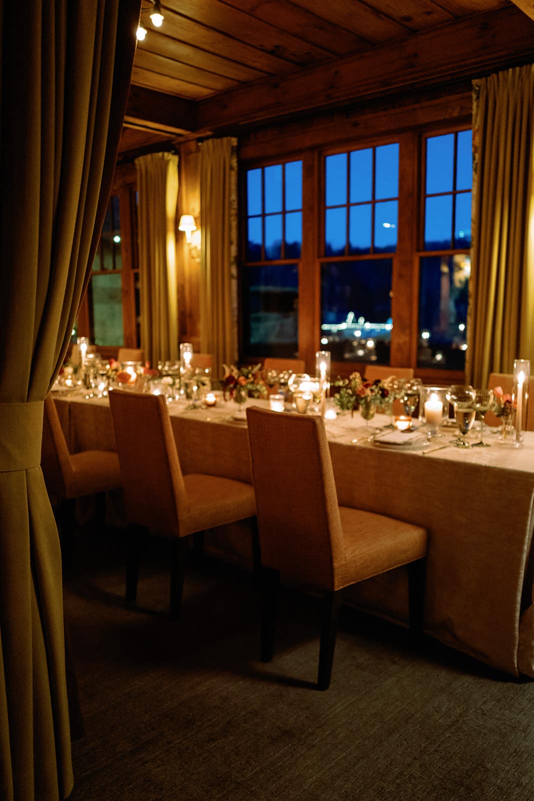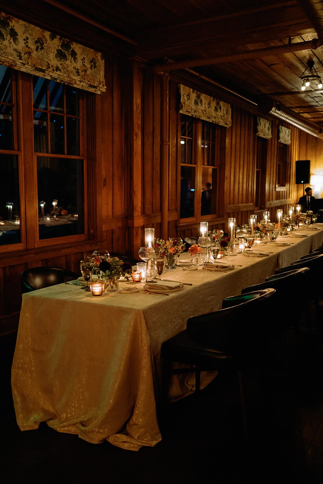 An autumn wedding at High Hampton in Cashiers, NC featured an intimate reception layered with candlelight, lush florals, and warm seasonal tones. With classic white-and-gold Audrey plates, gold flatware, and British green glassware, the tablescape struck the perfect balance of elegance and romance.