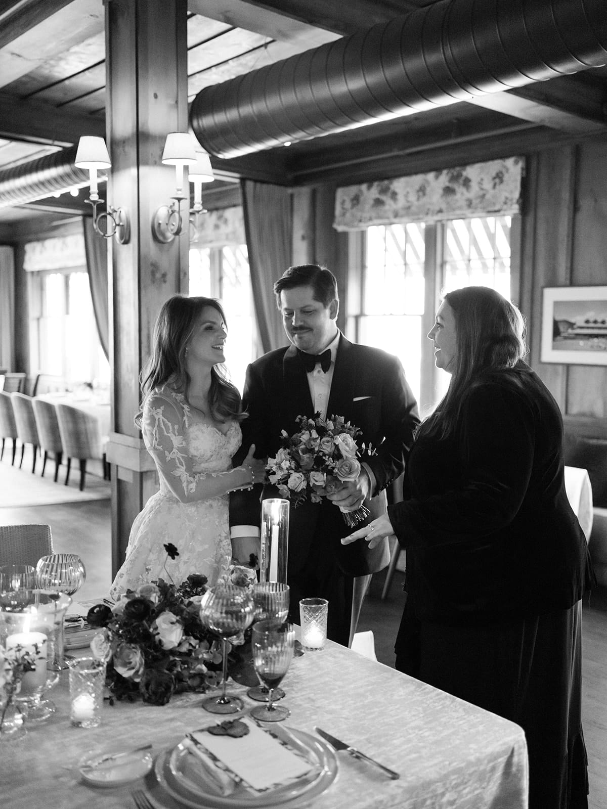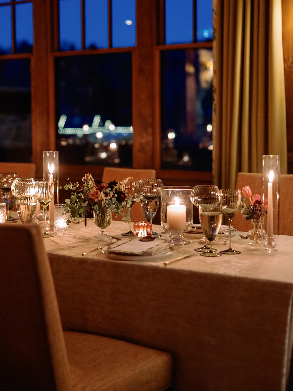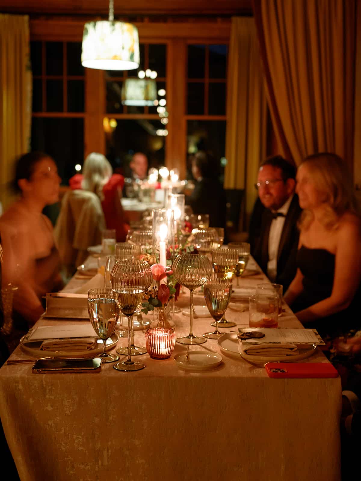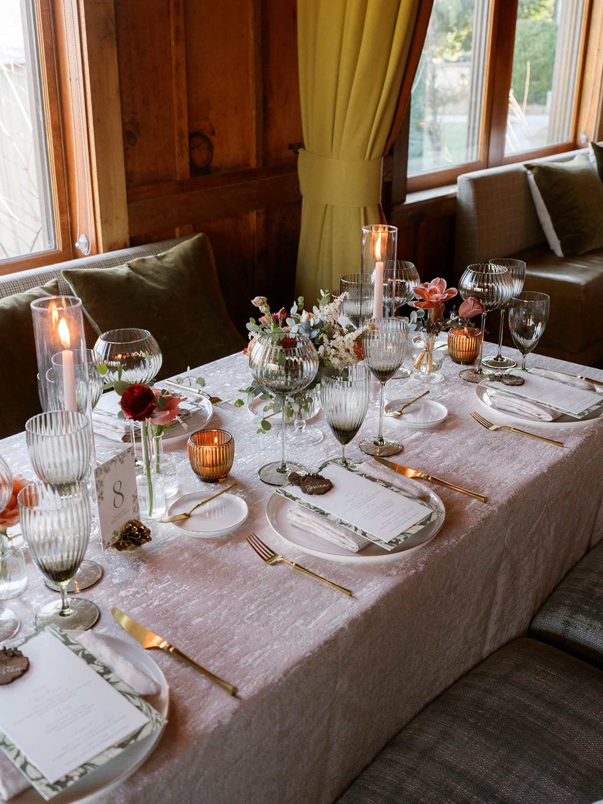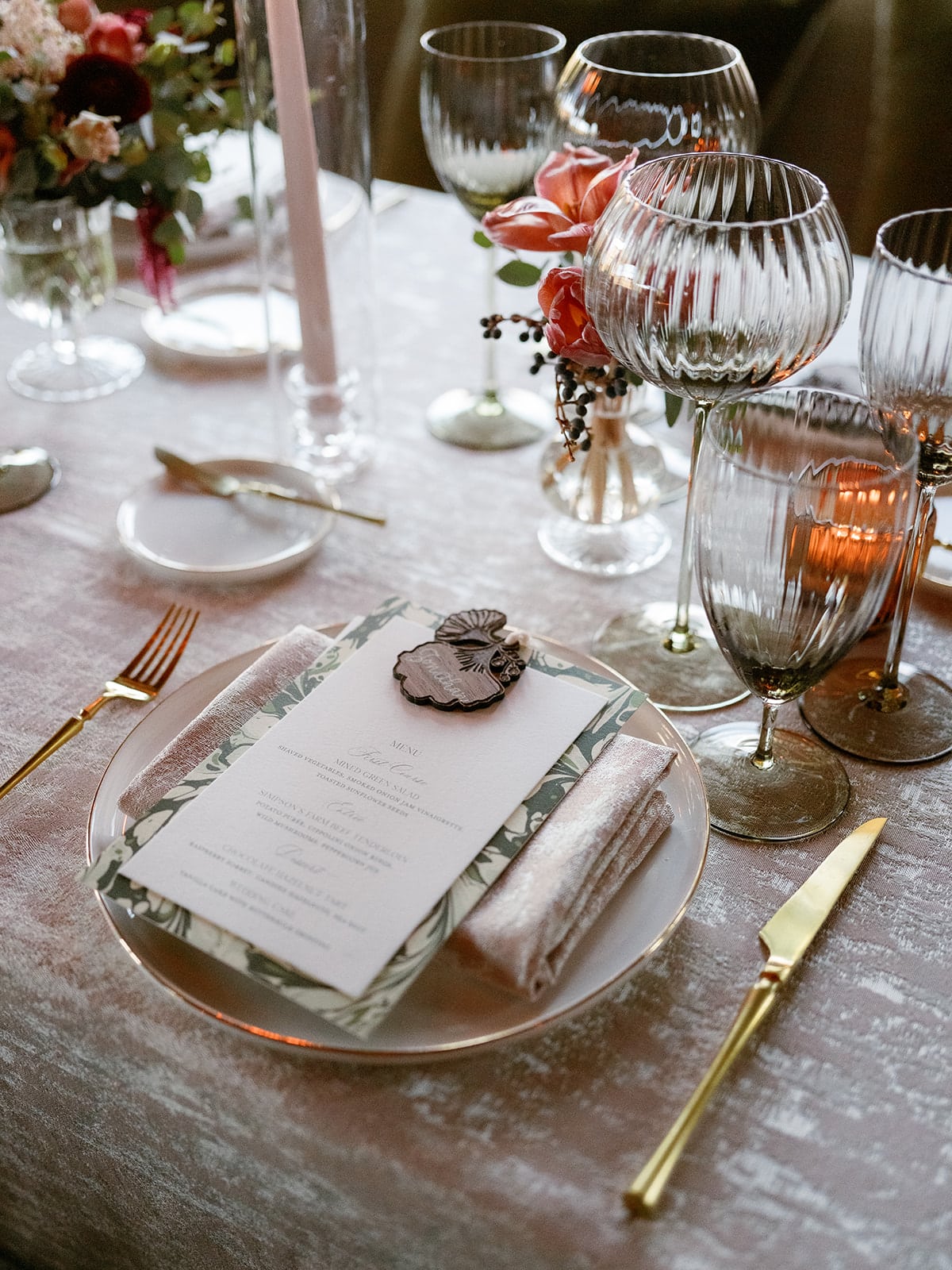 An autumn wedding at High Hampton in Cashiers, NC featured an intimate reception layered with candlelight, lush florals, and warm seasonal tones. With classic white-and-gold Audrey plates, gold flatware, and British green glassware, the tablescape struck the perfect balance of elegance and romance.