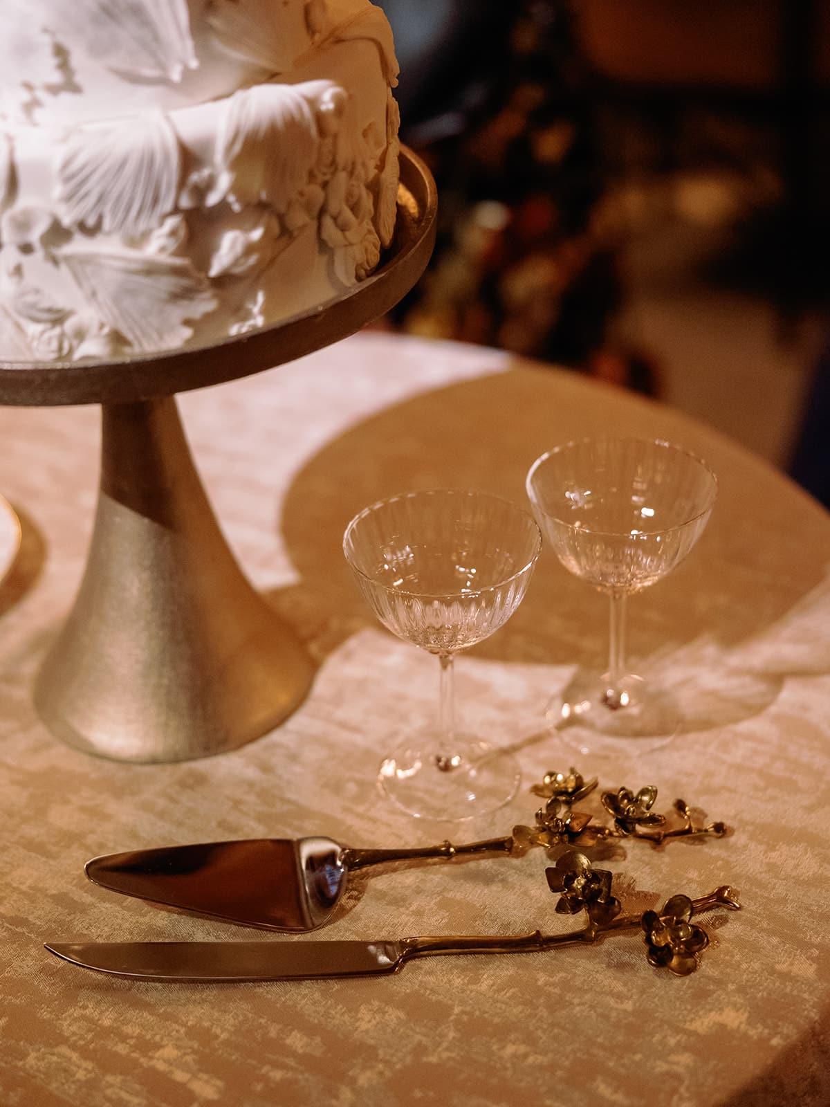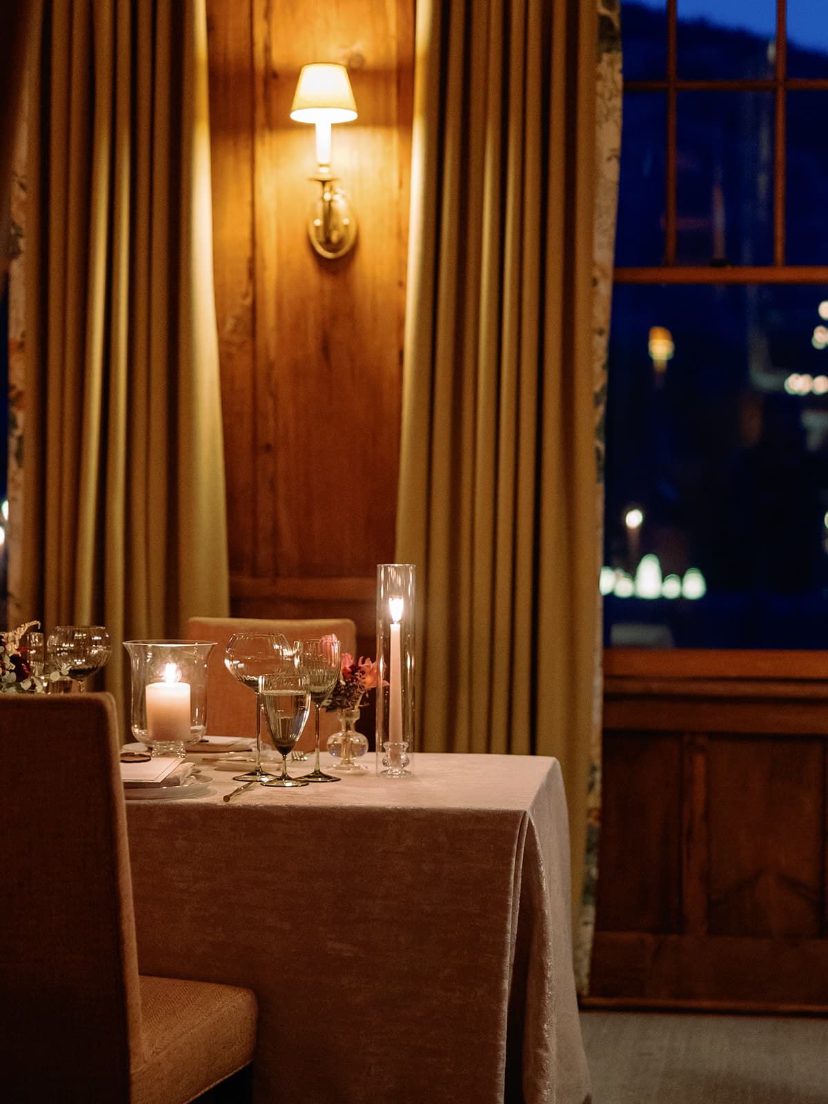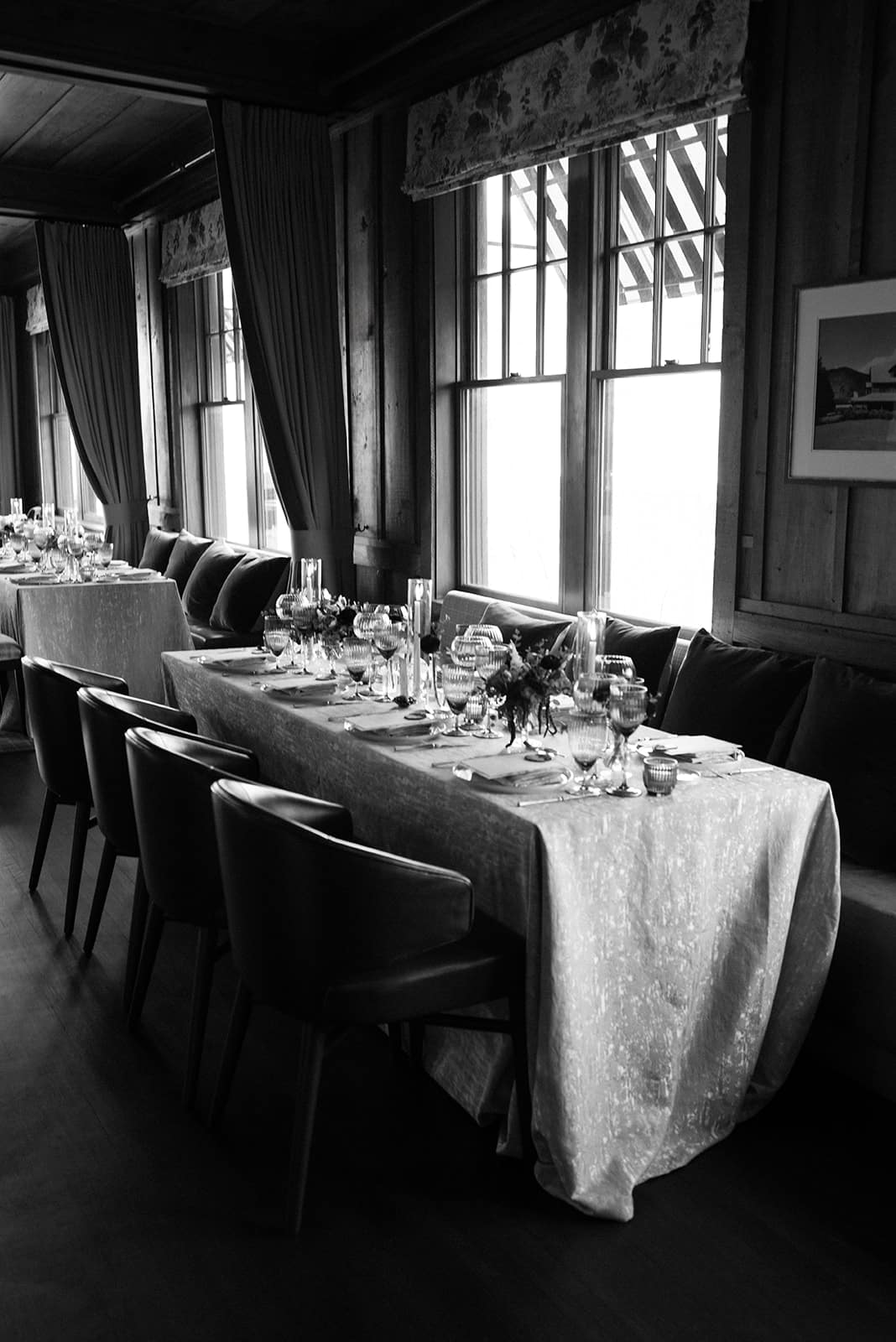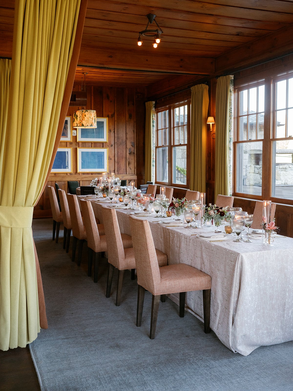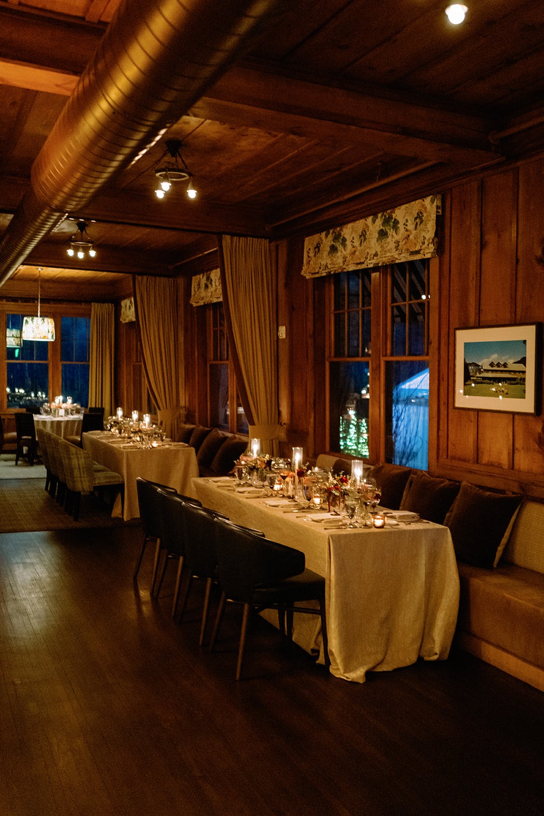 An autumn wedding at High Hampton in Cashiers, NC featured an intimate reception layered with candlelight, lush florals, and warm seasonal tones. With classic white-and-gold Audrey plates, gold flatware, and British green glassware, the tablescape struck the perfect balance of elegance and romance.