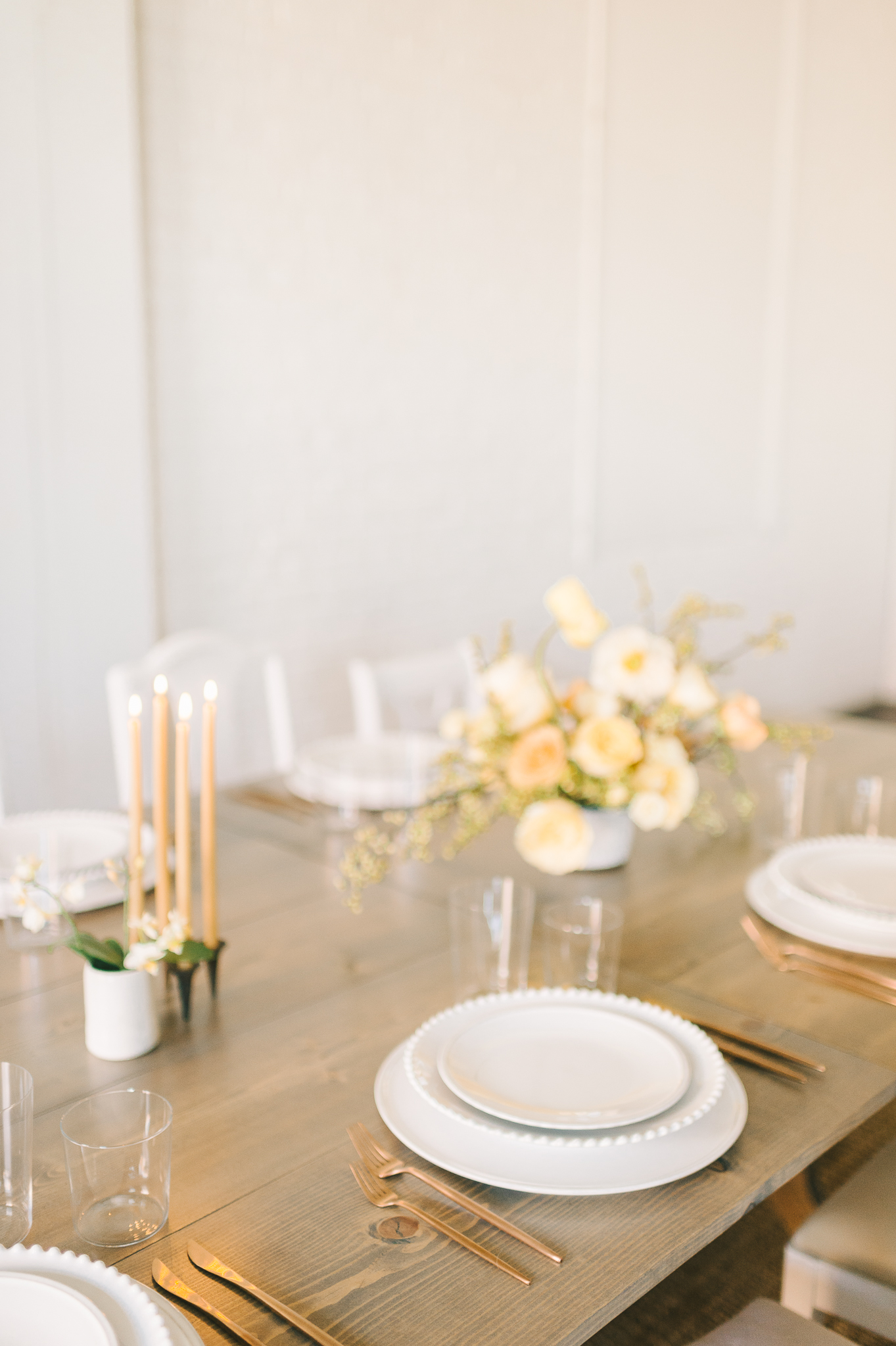 A tabletop wedding rental company based in charlottesville virginia offering beautiful tuscan inspired white plates and modern gold flatware.