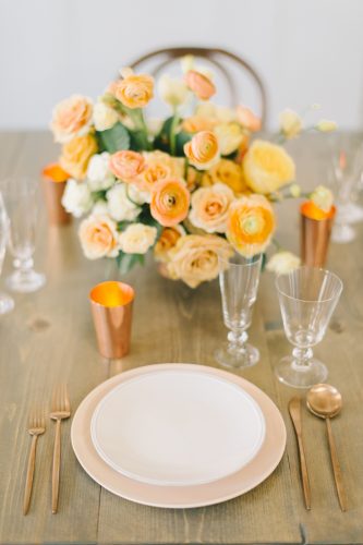 Tabletop rental with pink and white plates and yellow wedding ideas. Rose gold flatware and french wine and champagne glasses