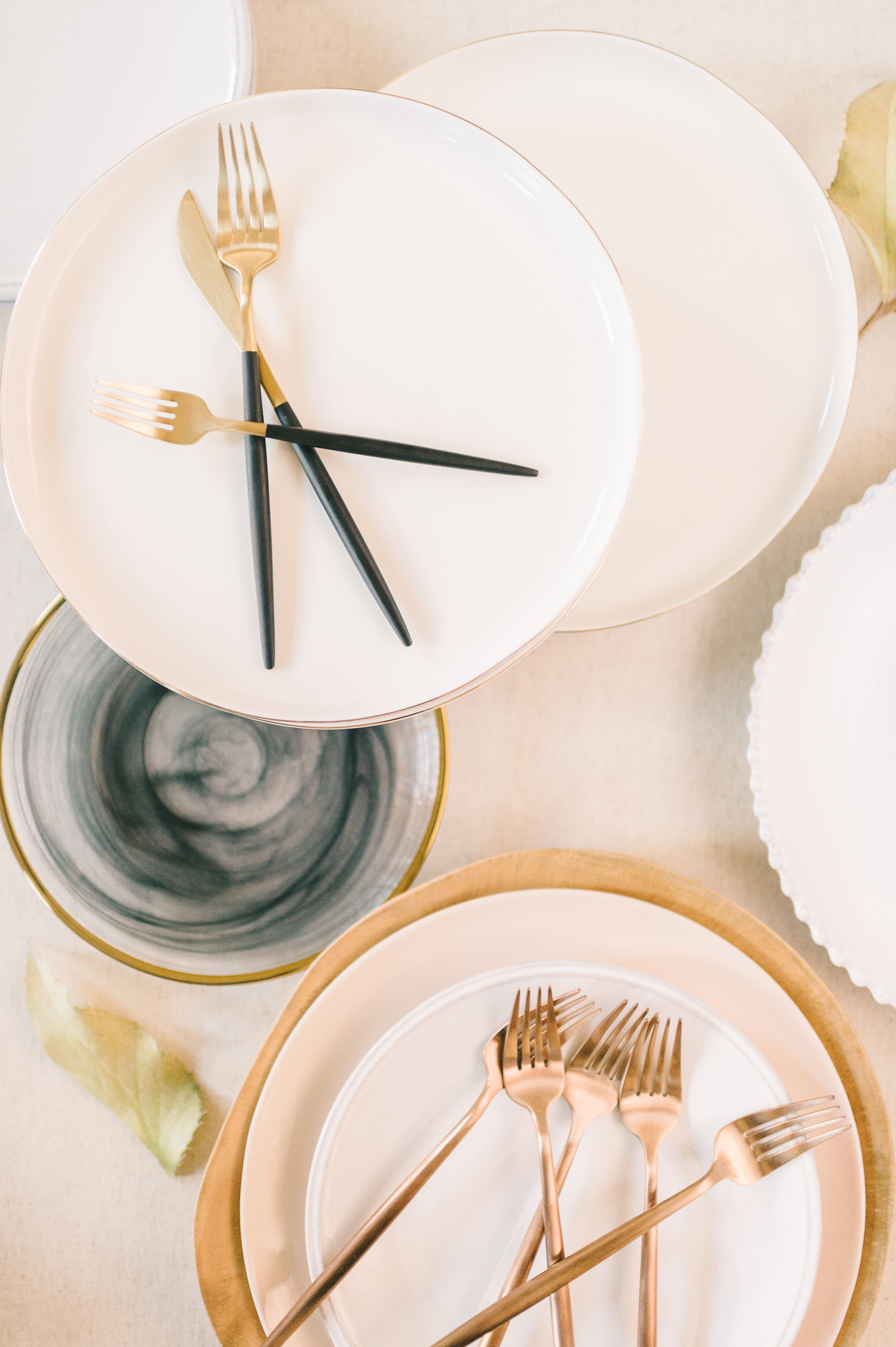 A sample image of our collection of rental inventory including white plates with pearl rims, matte black and gold flatware, and smoke grey and gold glass chargers and plates.