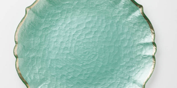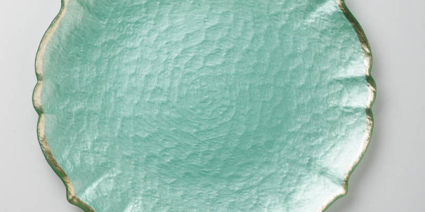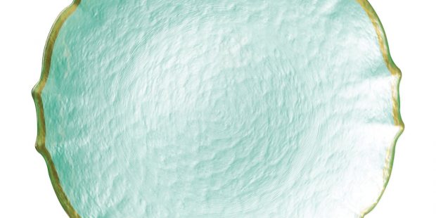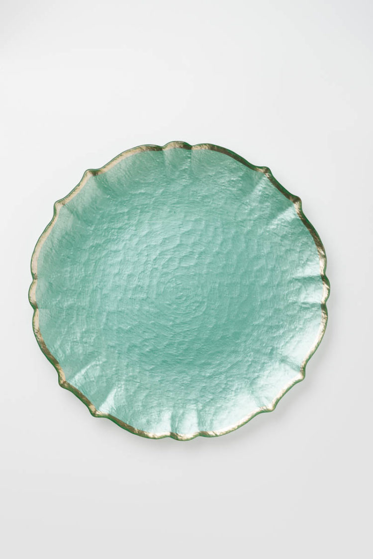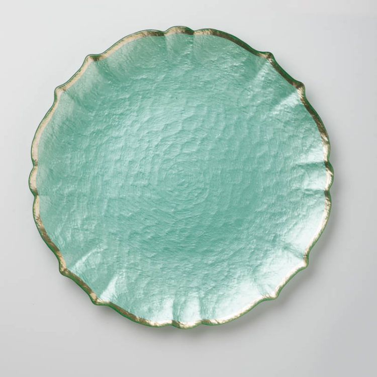Our Baroque glass charger brings a hint of glamour to your event. Available in Aque blue with a green rim. Also available in salad plate size.