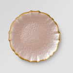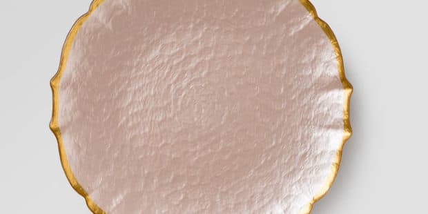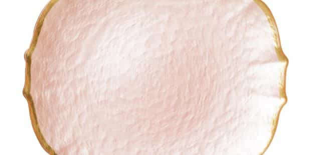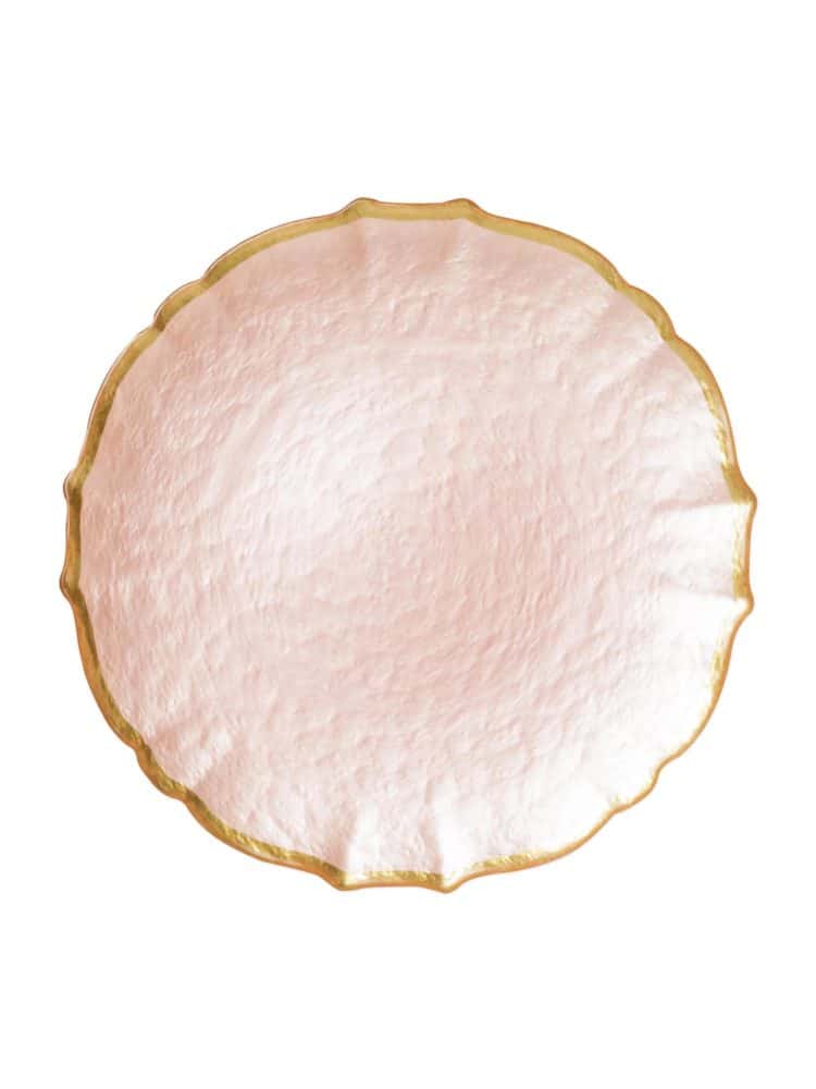 Our Baroque Glass Charger brings a hint of sparkle to your event. Available in pink with a gold rim. Also available in salad plate size.