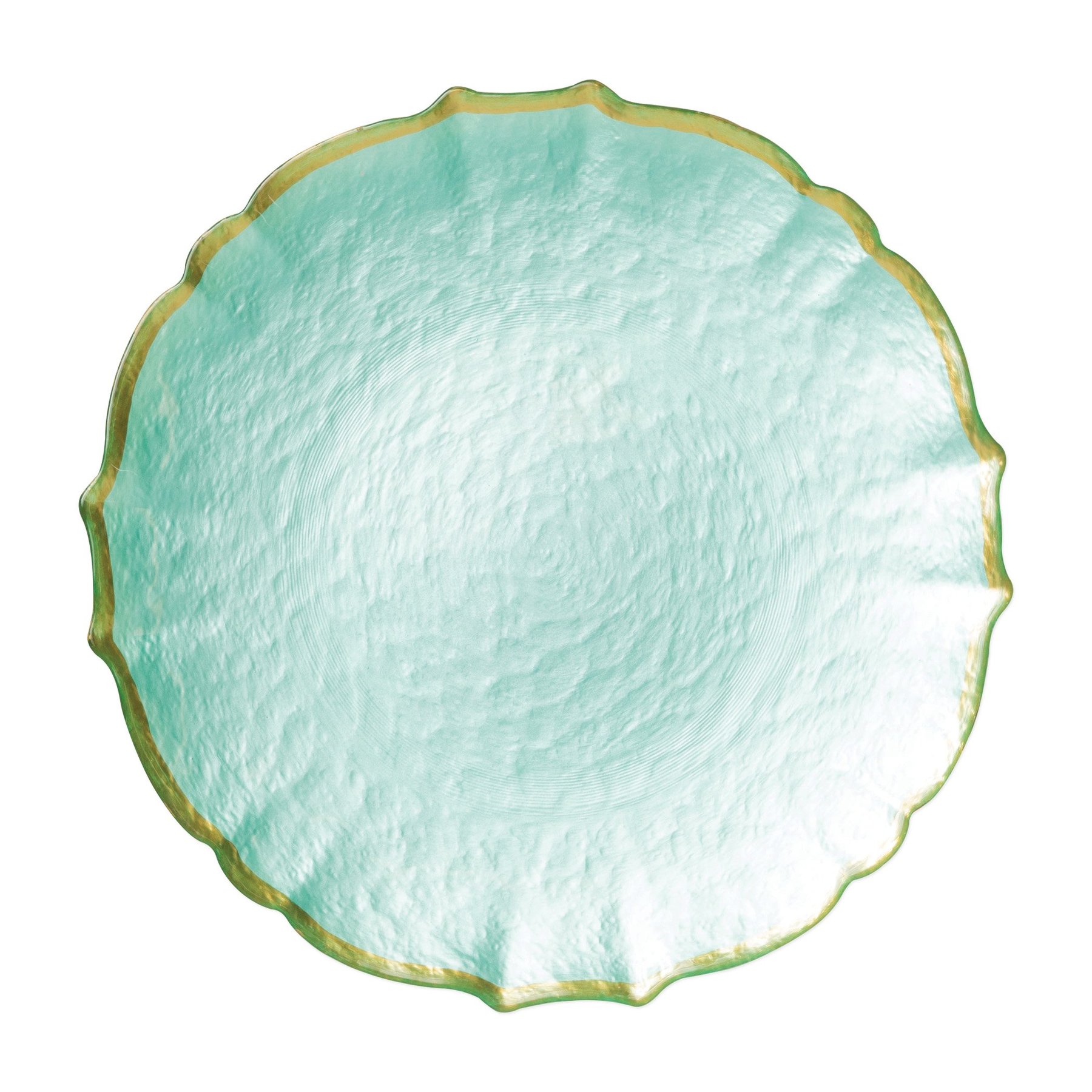 BAROQUE GLASS Charger plate in teal / aqua green with rim for rent for weddings and events