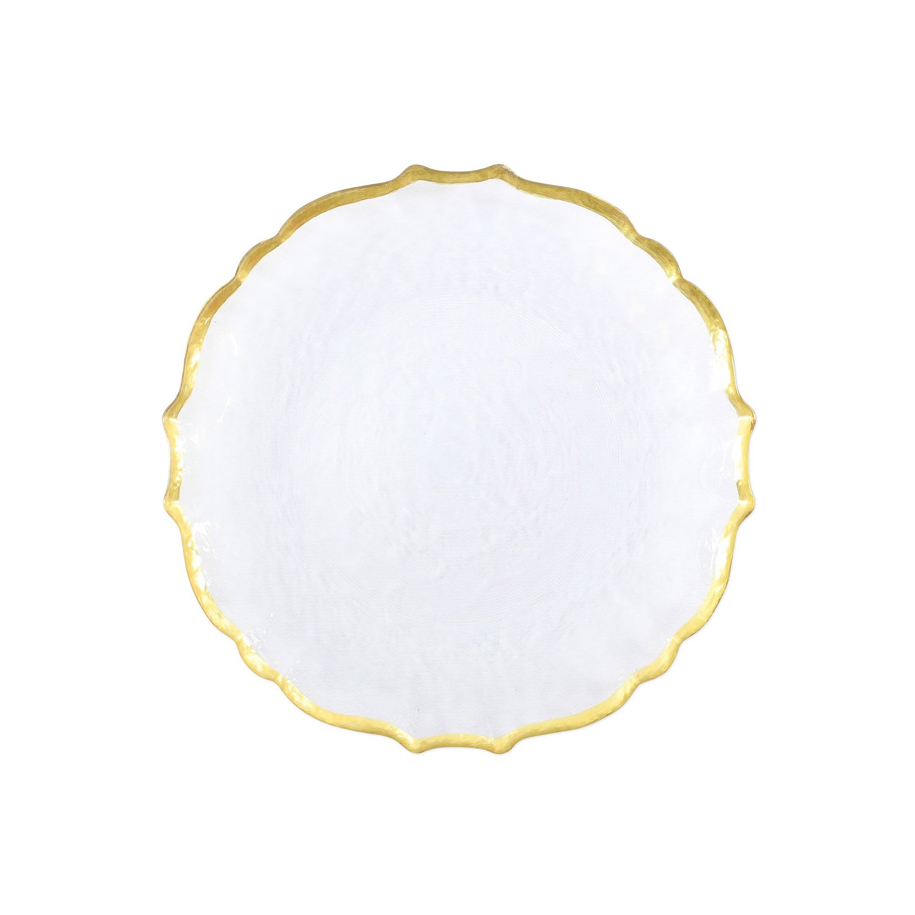 BAROQUE GLASS salad plate in clear white with gold rim for rent for weddings and events
