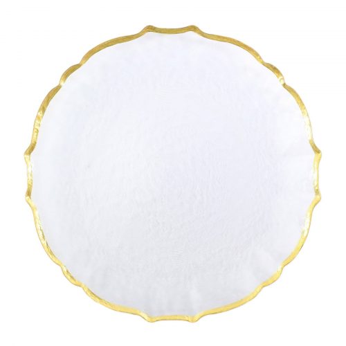 BAROQUE GLASS CHARGER in clear white with gold rim for rent for weddings and events