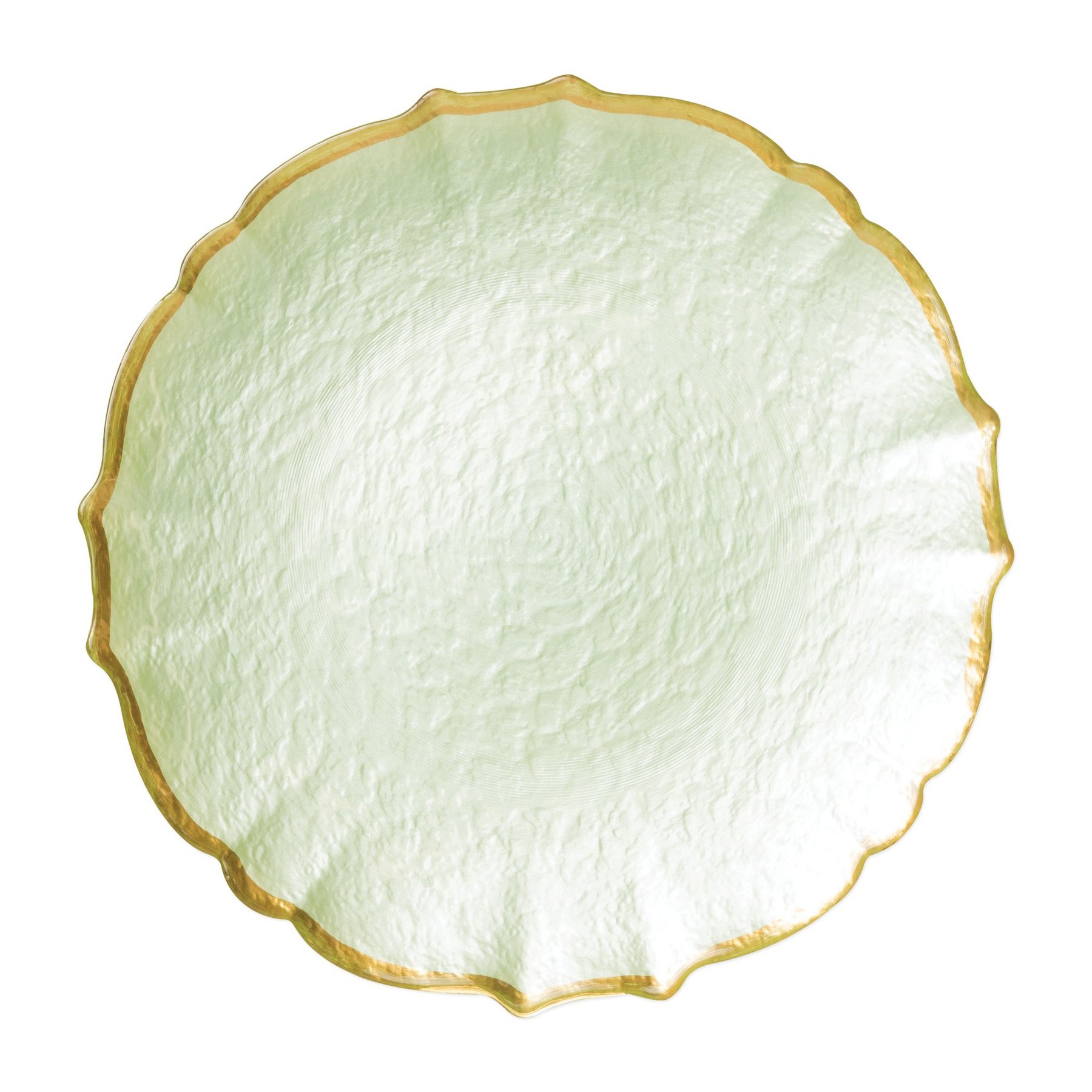 BAROQUE GLASS CHARGER in pistachio green for rent for weddings and events