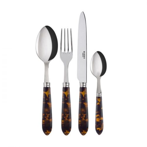 Tortoise flatware dinner fork, salad fork, dinner knife, salad knife, soup spoon and coffee spoon for rent for weddings and special events