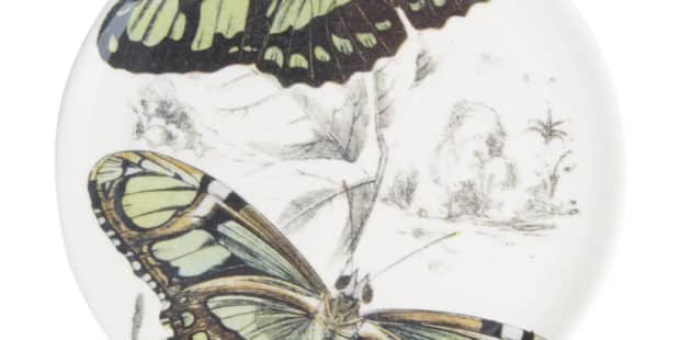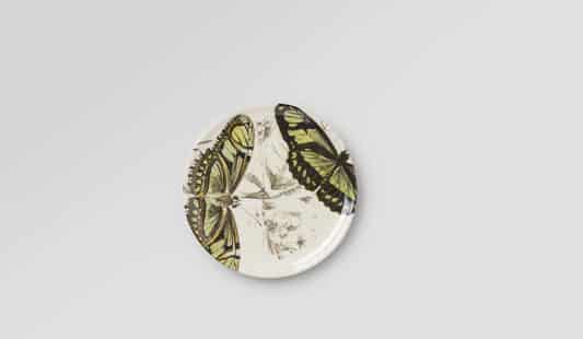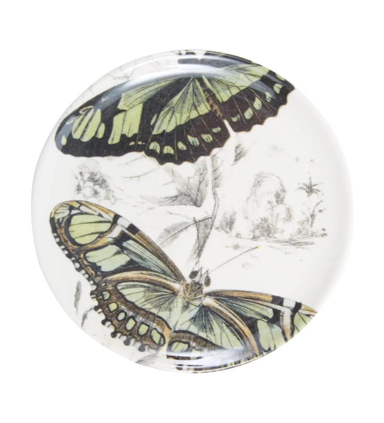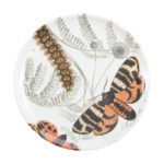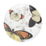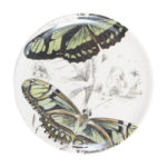 A durable yet beautiful melamine plate with varying butterfly, insect, and botanical illustration.