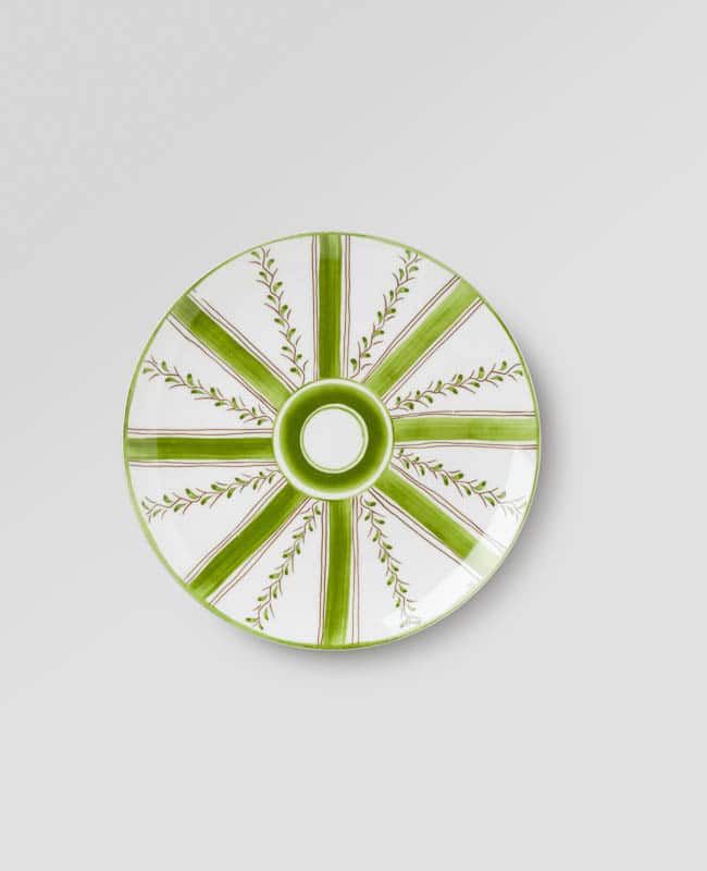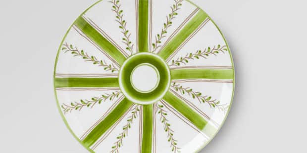 Bedecked with alternating stripes of ribbon and garlands of florals, this collection offers a romantic take on classic painted dinnerware.