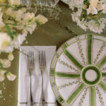 Bedecked with alternating stripes of ribbon and garlands of florals, this collection offers a romantic take on classic painted dinnerware.
