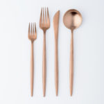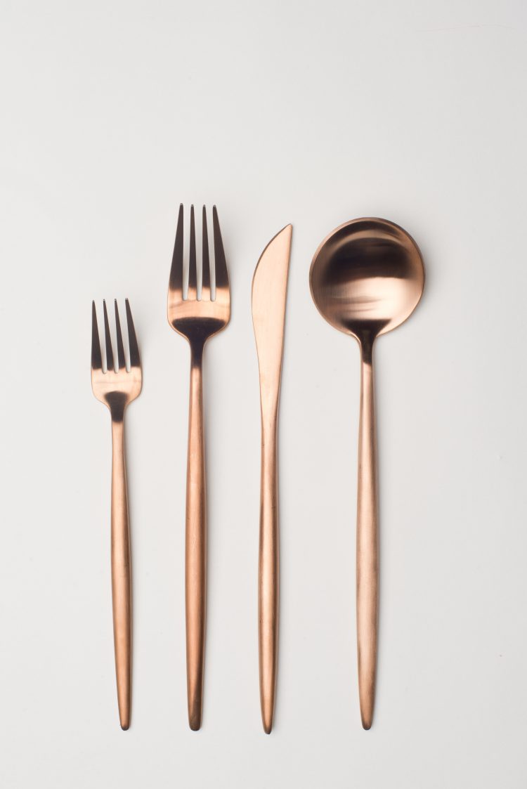The flatware you've been searching the world over. This setting was chosen specifically because of its high demand. Reads rose gold or copper depending on how you pair it!