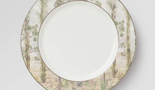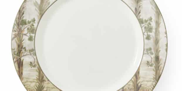 Created by the iconic Kit Kemp, each dinner plate features a white center with a detailed border of swaying tree illustrations in soft, chalky shades. Layer with the matching salad plates and soup bowls.