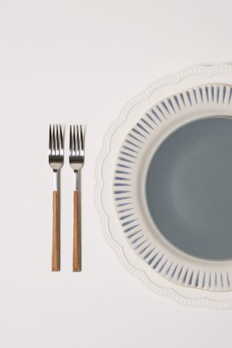 charlottesville-virginia-party-rental-store-emerson-james white lace charger blue and white plate bread and butter salad dinner wooden handle flatware