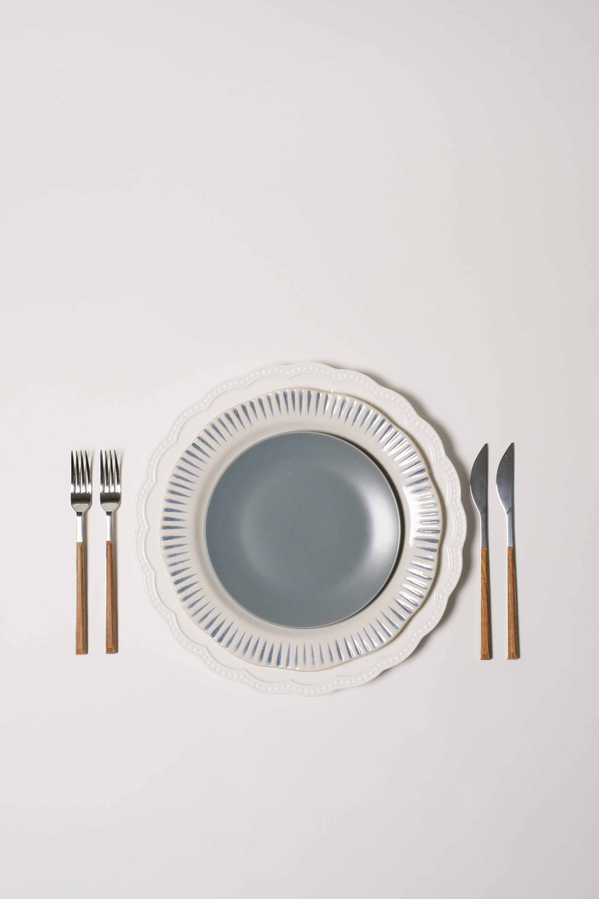 charlottesville-virginia-party-rental-store-emerson-james white lace charger blue and white plate bread and butter salad dinner wooden handle flatware