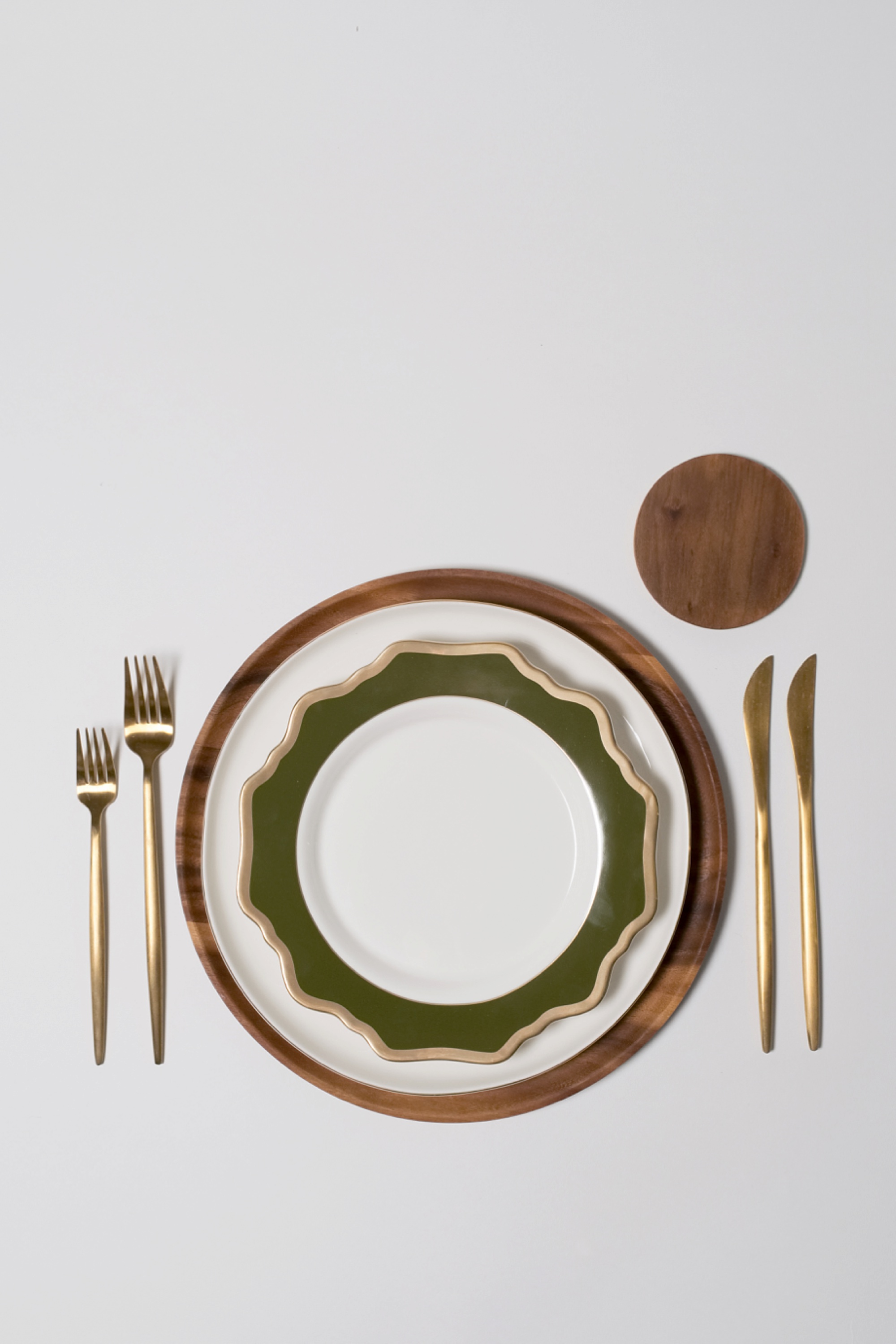 charlottesville-virginia-party-rental-store-emerson wedding collection tabletop gold flatware acacia wooden charger gold and white dinner plate green and gold salad plate