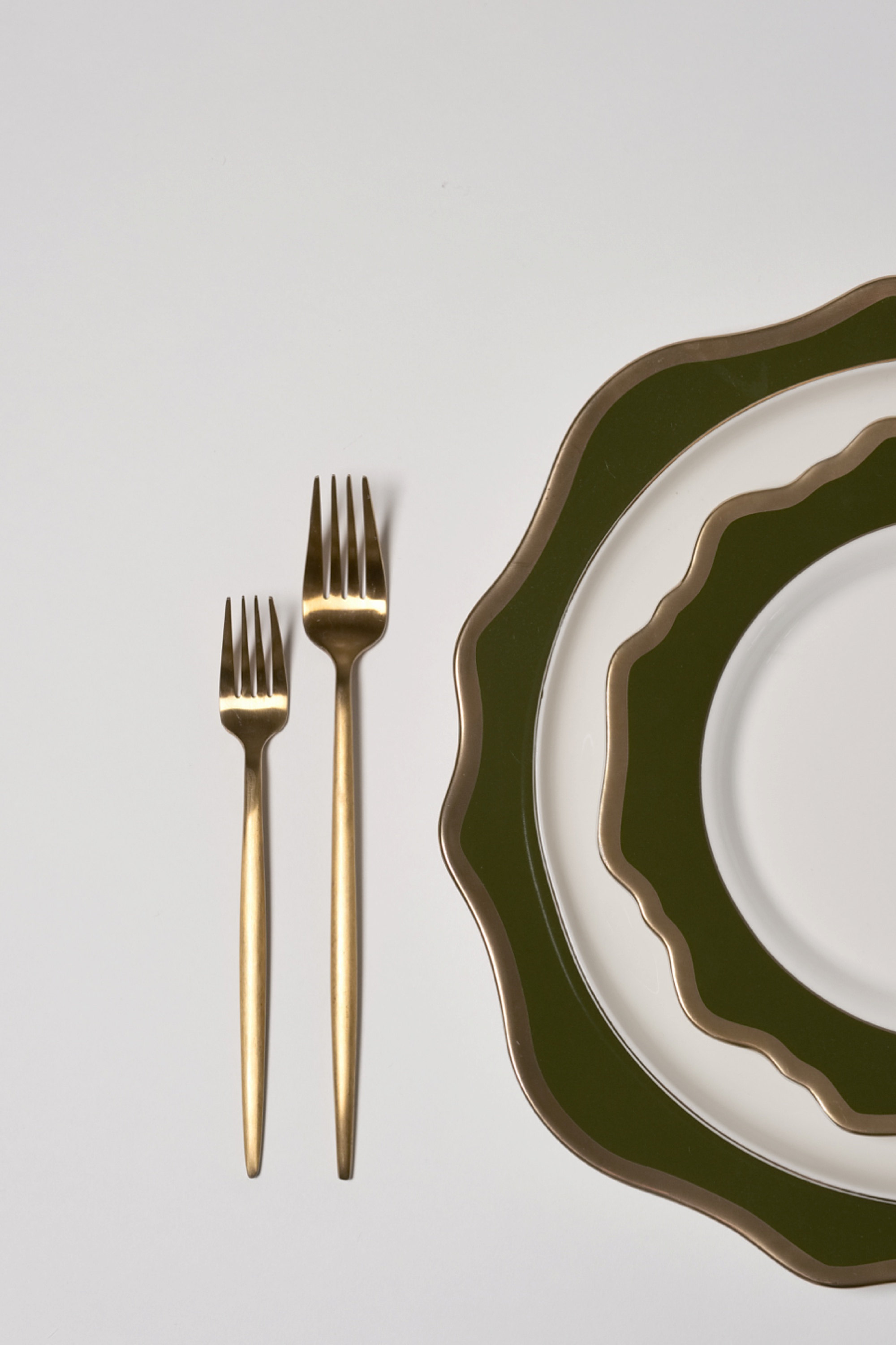 charlottesville-virginia-party-rental-store-emerson-james wedding event tabletop gold flatware green anna charger white audrey dinner plate green salad plate crescent wine glass spanish water glass