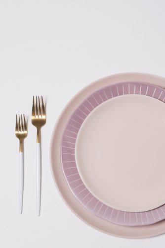 charlottesville-virginia-party-rental-store-emerson-james wedding event tabletop pink charger purple dinner plate pink salad plate gold and white flatware
